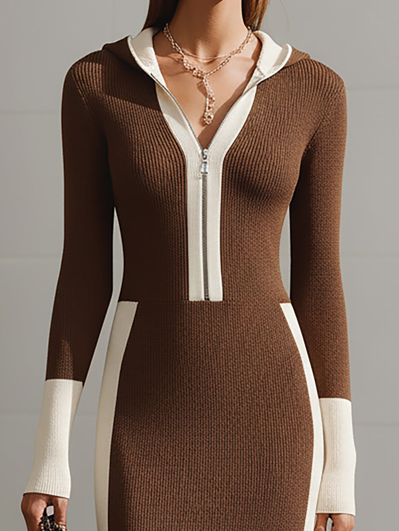 Contrast Hooded Knit Midi Dress In Cream And Brown
