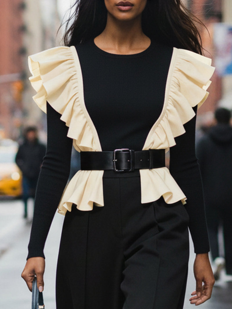 Caramel-colored Off-shoulder Suit Collar Ruffled Wide-leg Pants Set