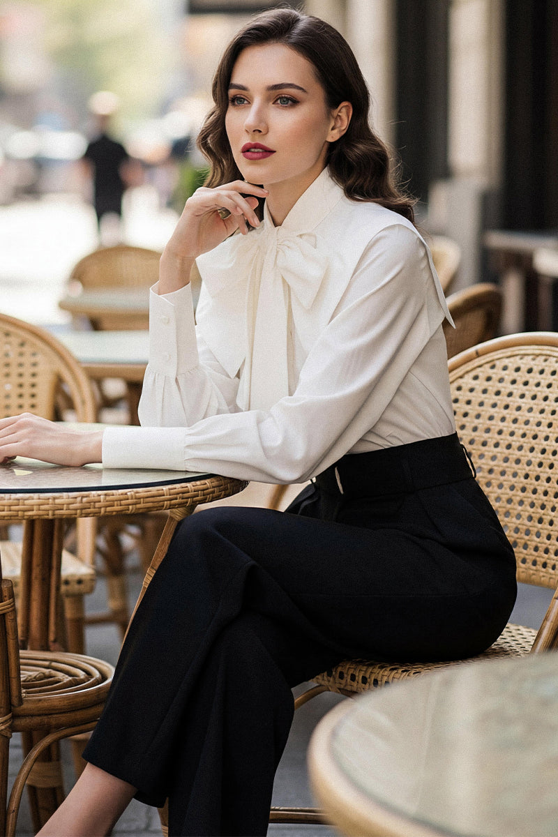 Chicnery Satin Bow Tie Black Tweed Bell-sleeves Top And Pleated Skirt Suits