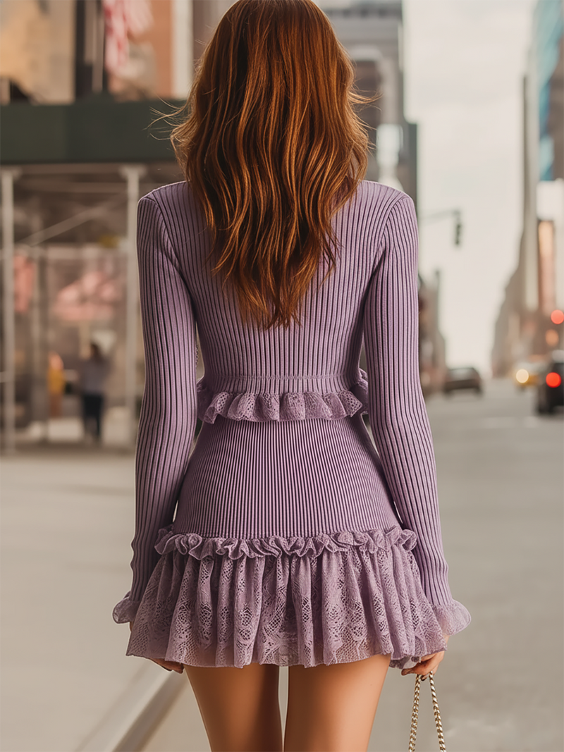 Lilac Knit Two-Piece With Lace Ruffle Details