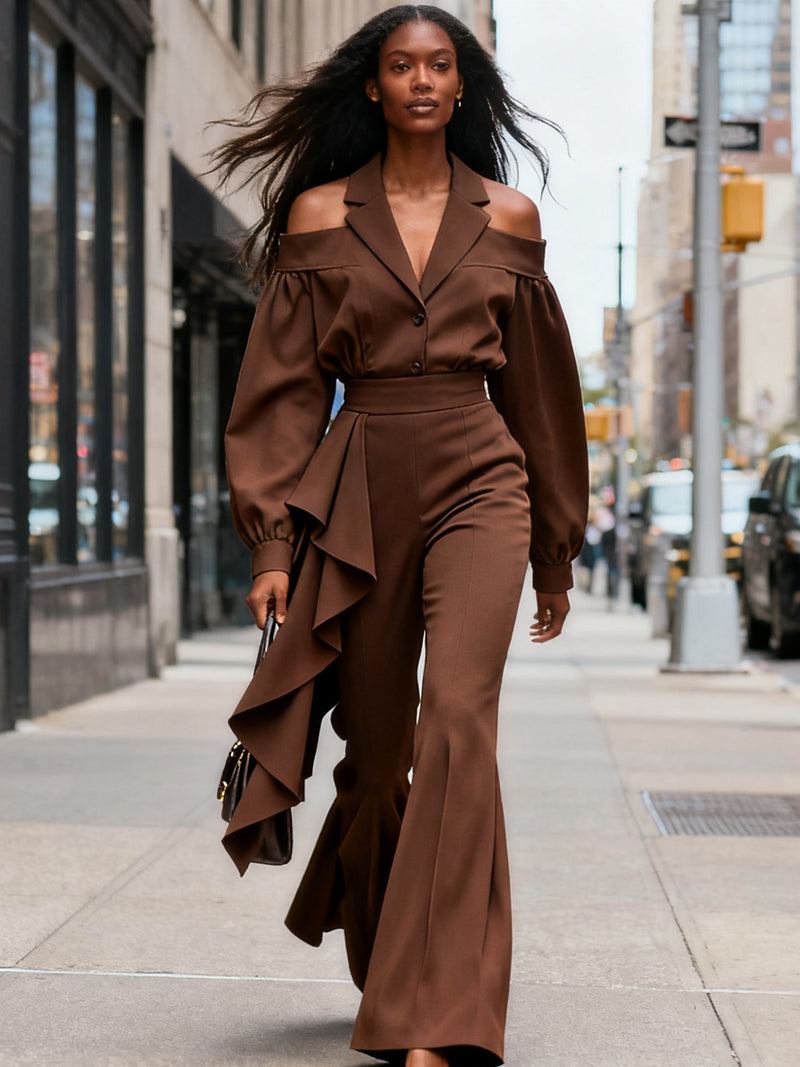Caramel-colored Off-shoulder Suit Collar Ruffled Wide-leg Pants Set