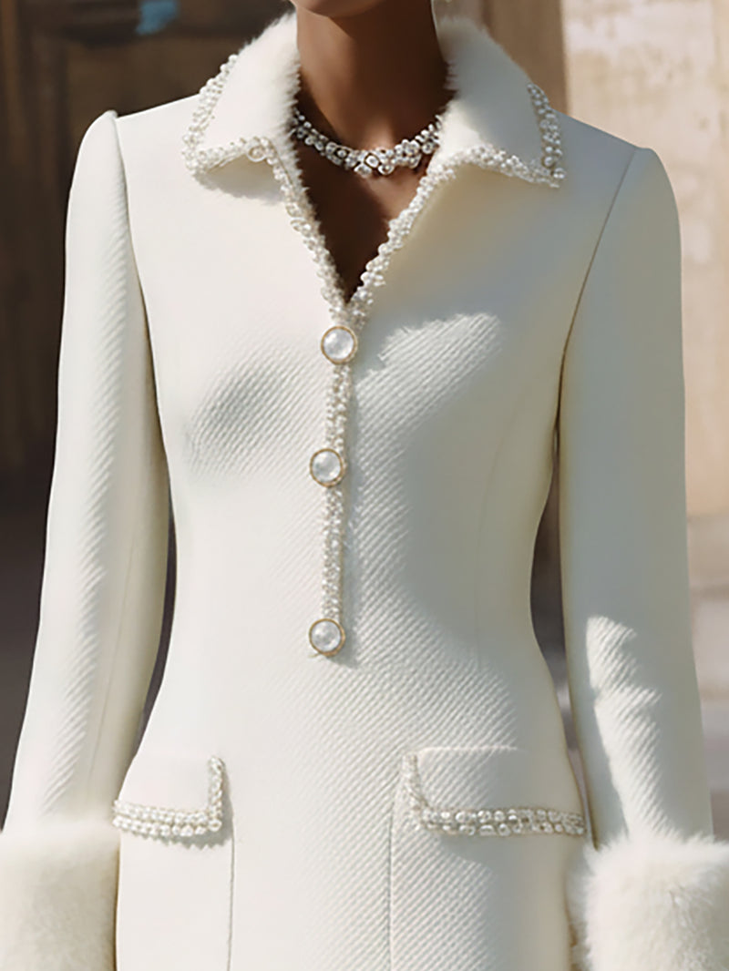 Elegant White Dress With Furry Cuffs And Pearl Details