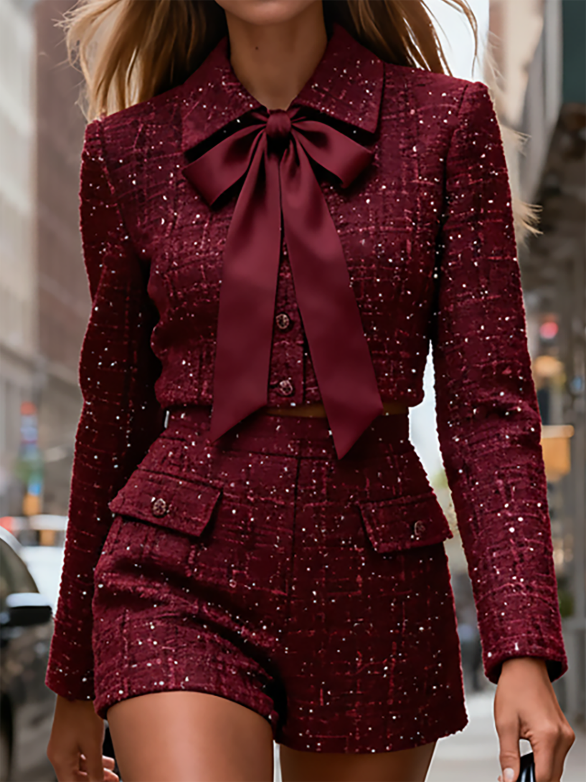 This burgundy tweed co-ord set features a cropped jacket with a satin bow tie and a pair of tailored shorts, creating a chic and sophisticated silhouette. The structured design and classic tweed pattern make it perfect for both formal events and stylish casual outings.