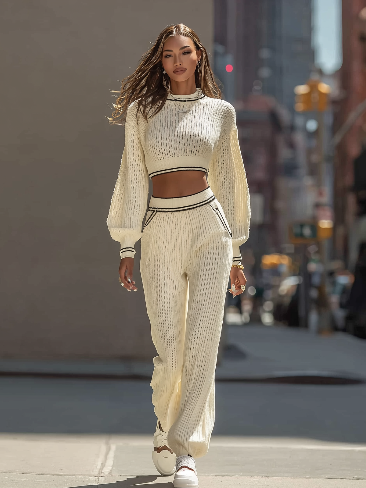 This cream two-piece set features a cropped sweater with puff sleeves and flared pants, both accented with black trim, creating a chic and coordinated look. It’s perfect for adding a touch of style to your casual or semi-formal outfits.