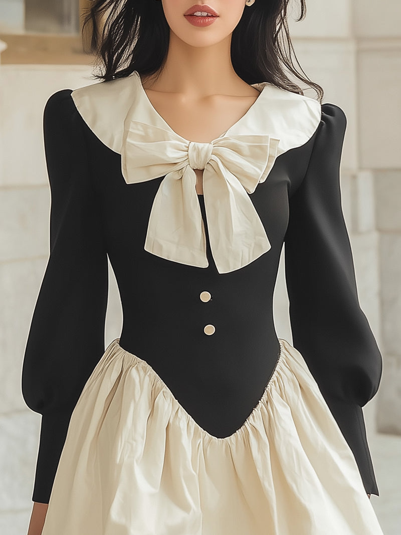 Black And White Contrasting Color Bow-tie Collar Flared Dress