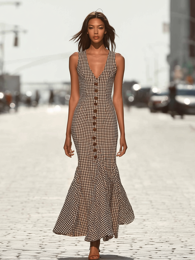 Stylish Fitted Gingham Mermaid Maxi Dress
