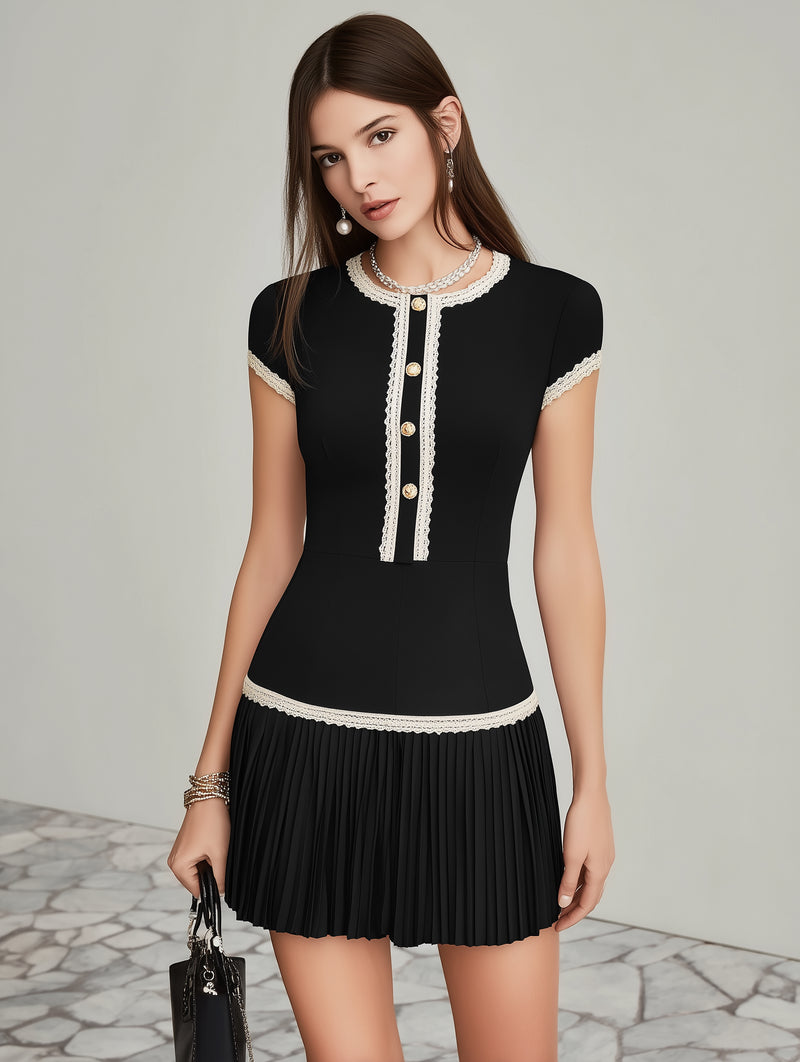 Chic Black Mini Dress With White Lace Trim