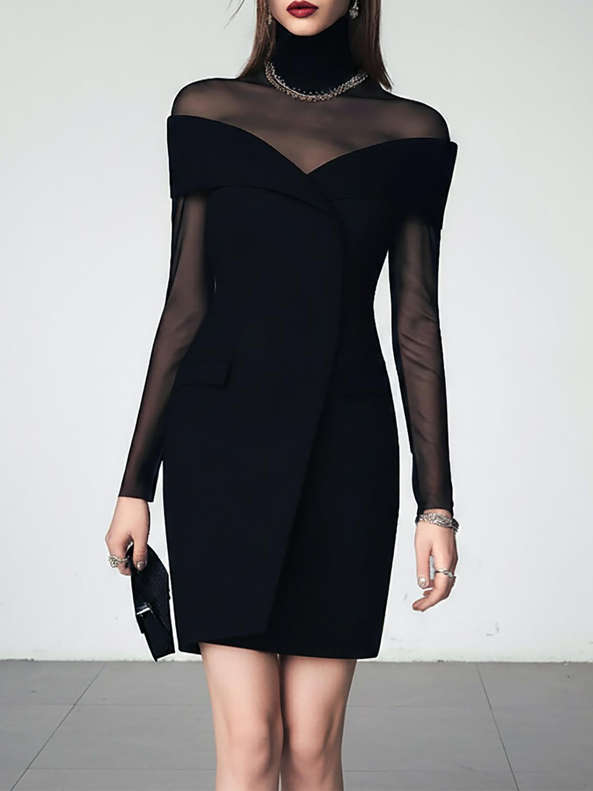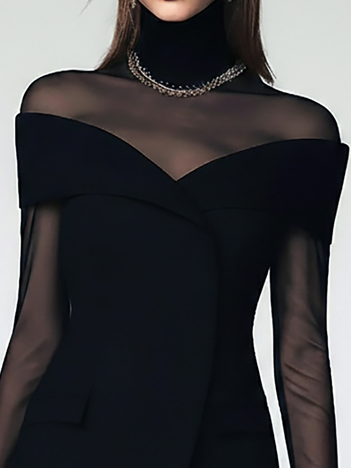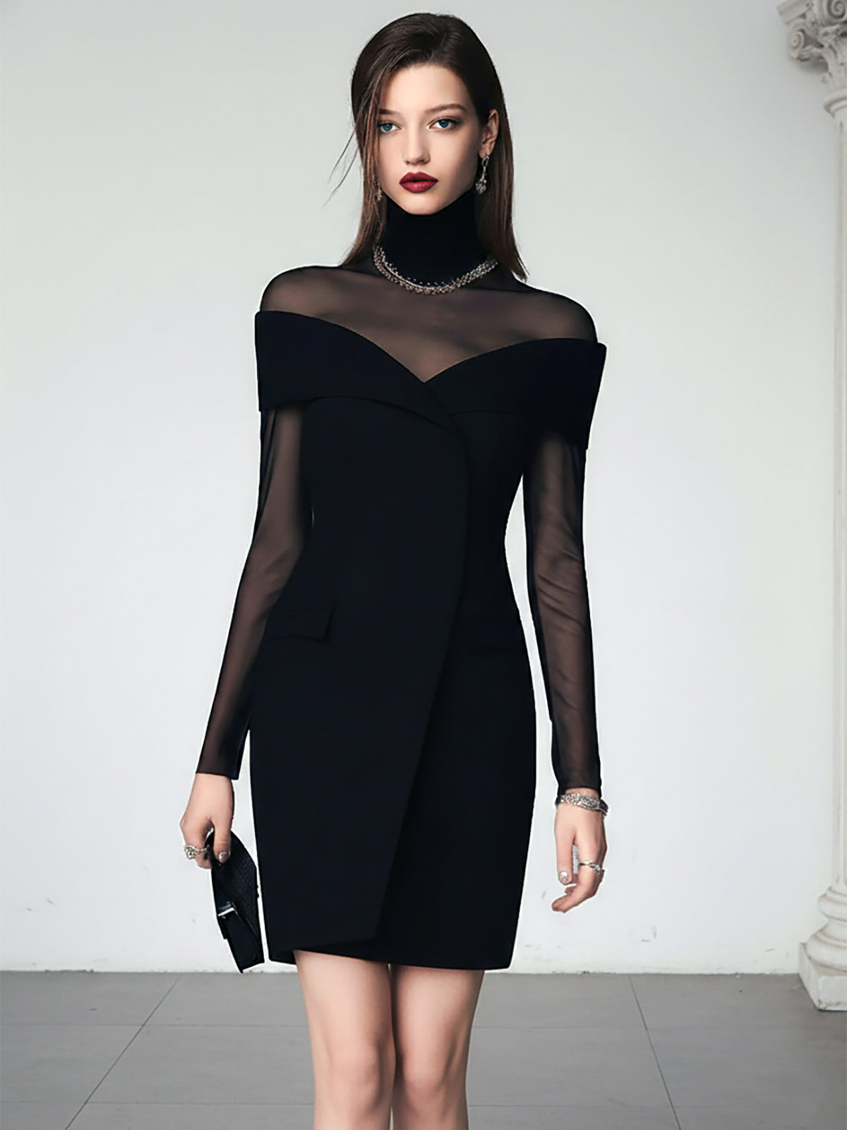 • Design: Features an elegant off-shoulder neckline with sheer black mesh long sleeves, creating a sophisticated and alluring silhouette