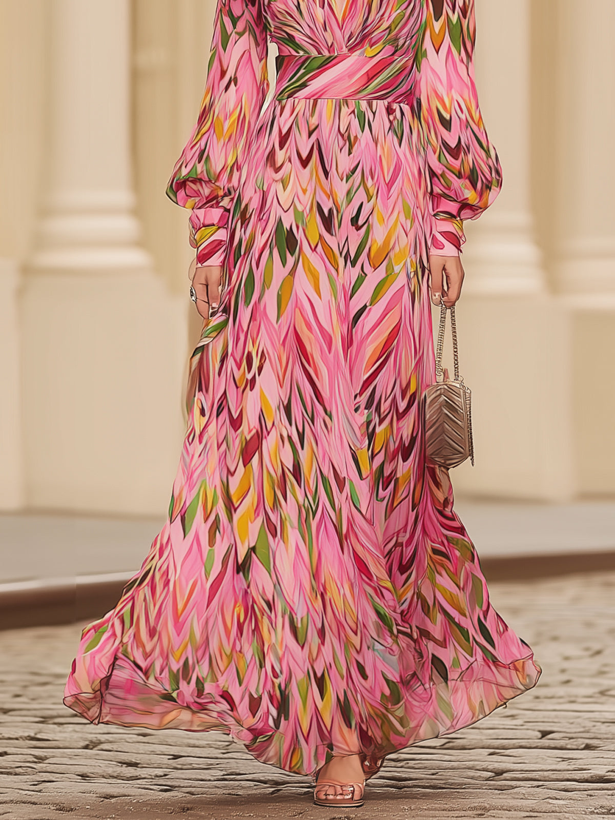 Color-blocked Geometric Print Chiffon Maxi Dress