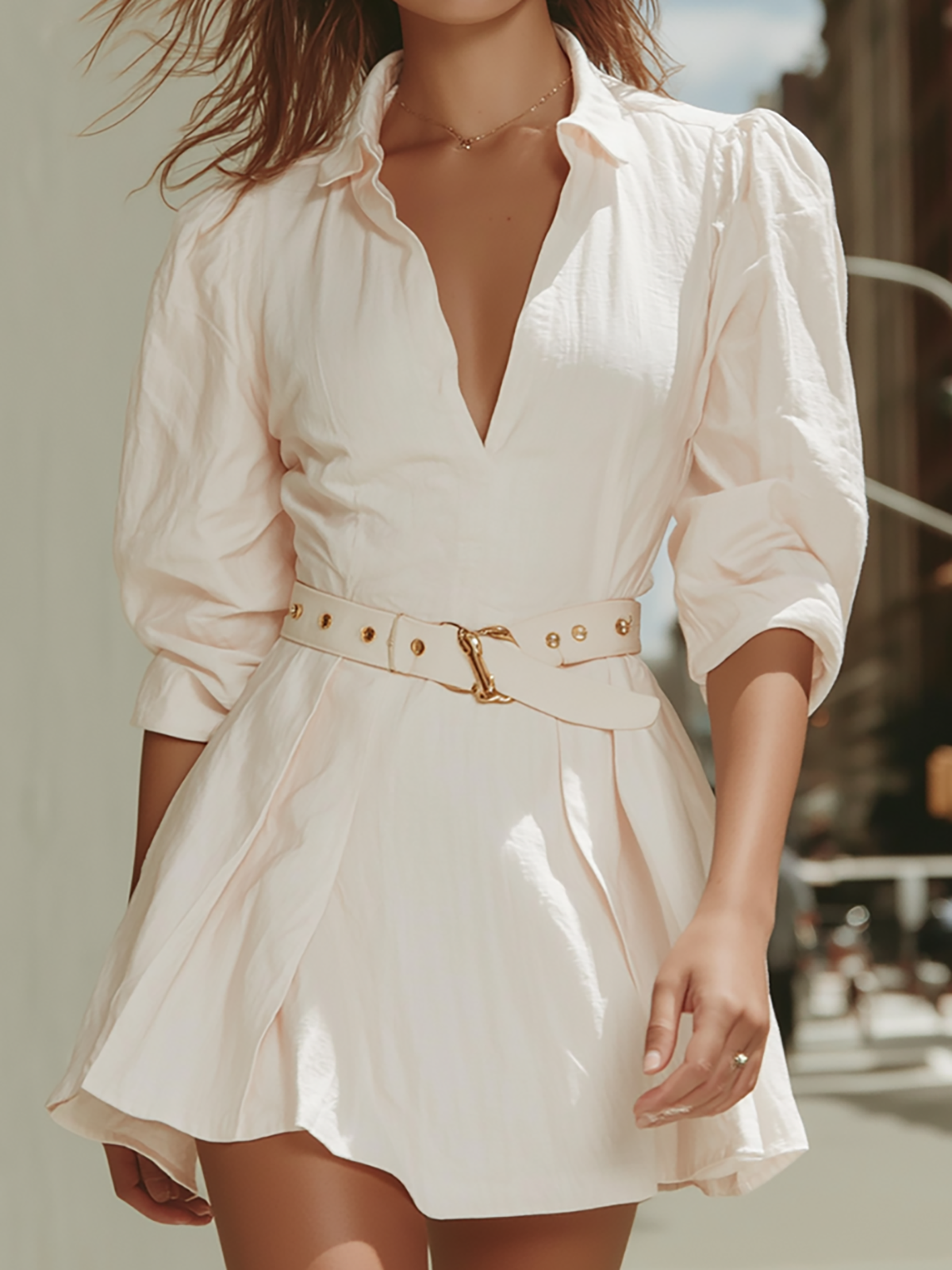 This cream mini shirt dress blends casual chic with polished sophistication. It features a classic collared neckline, voluminous puff sleeves, and a deep V-front that exudes modern allure. A wide, matching belt with gold hardware cinches the waist, creating a flattering silhouette, while the flared hem adds playful movement. Perfect for brunch, city strolls, or daytime events, this dress pairs effortlessly with sandals or ankle boots for a fresh, timeless look.