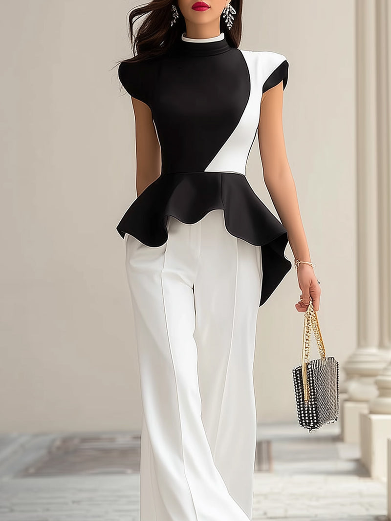Asymmetrical Color-blocked Ruffled Wide-leg Suit