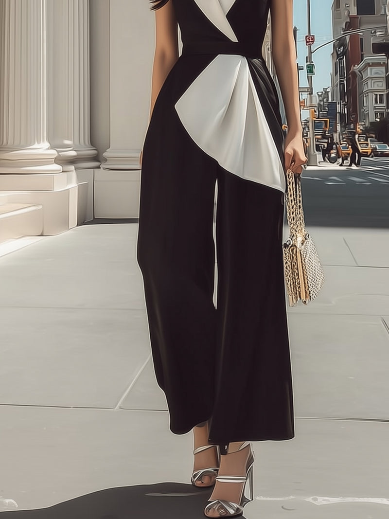 Black And White Color-blocked Sleeveless Fitted Waist Wide-leg Jumpsuit