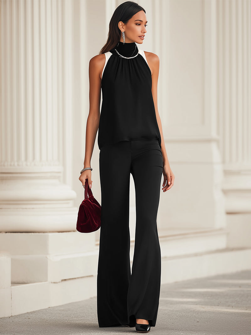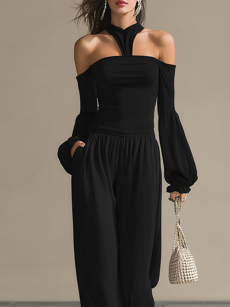 Halter Neck Off-shoulder Bell Sleeve Wide-leg Set