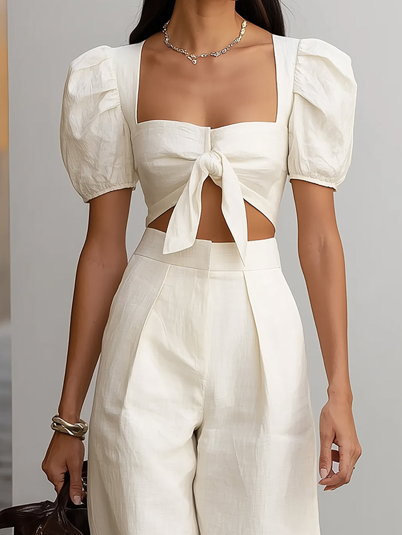 Cream Puff Sleeve Crop Top And Wide Leg Pants Set