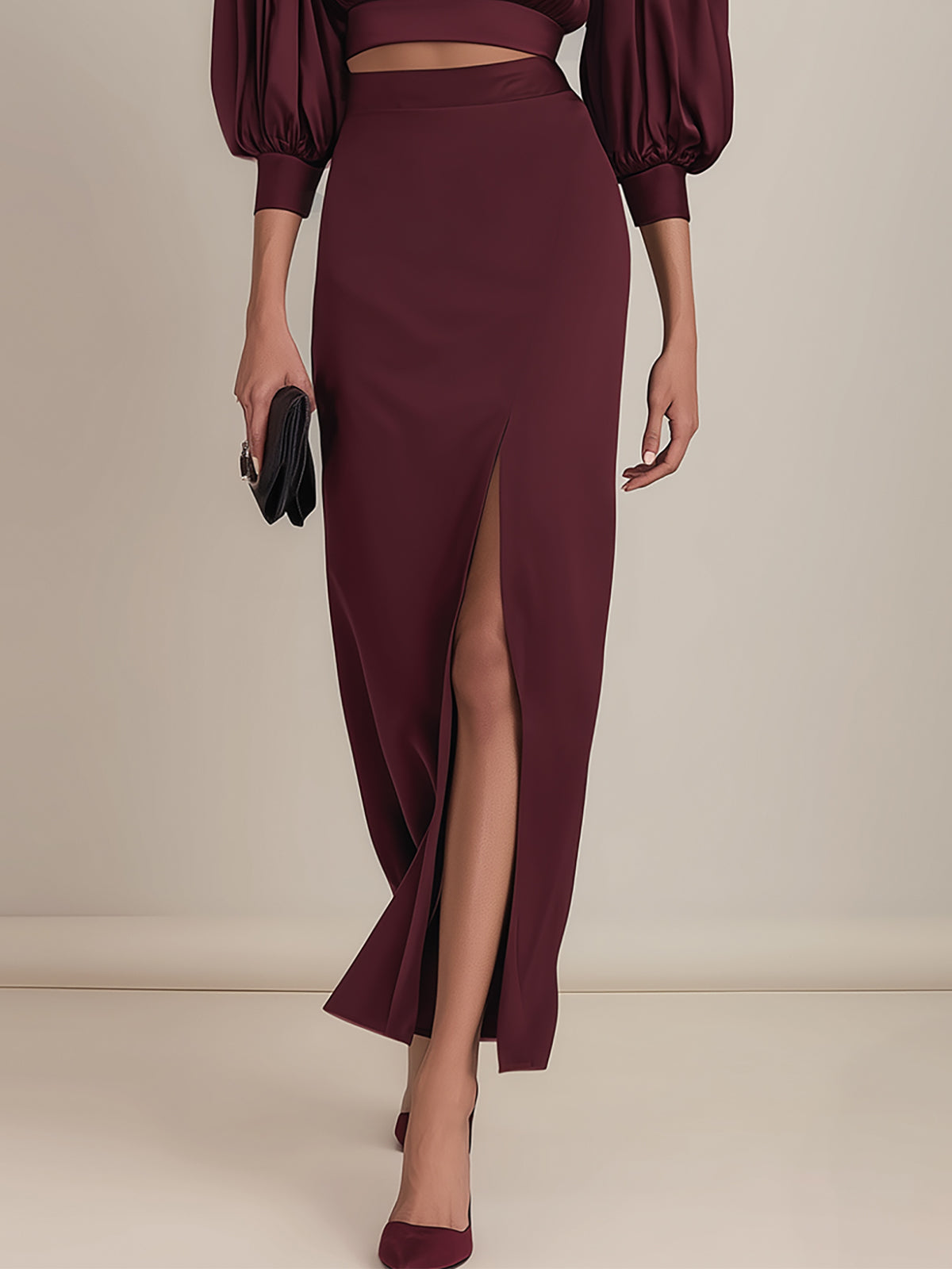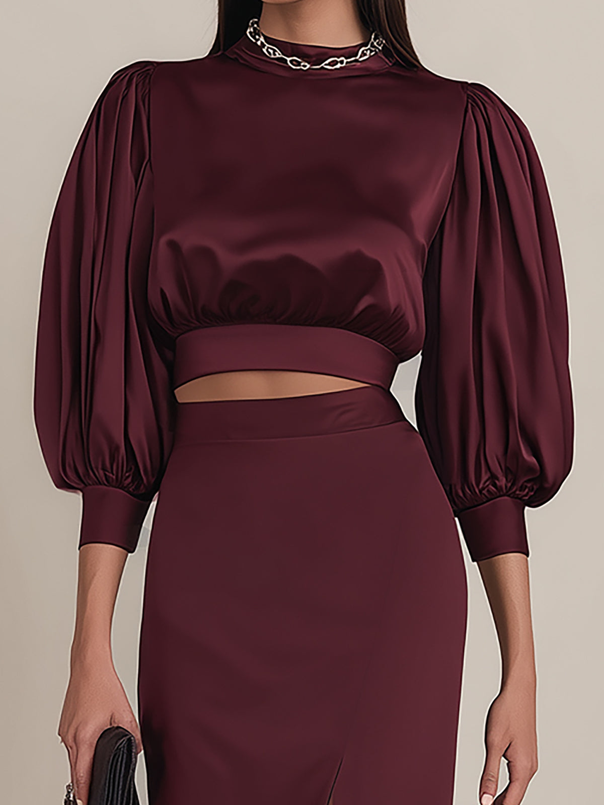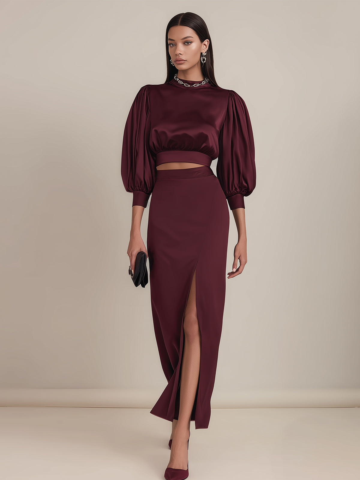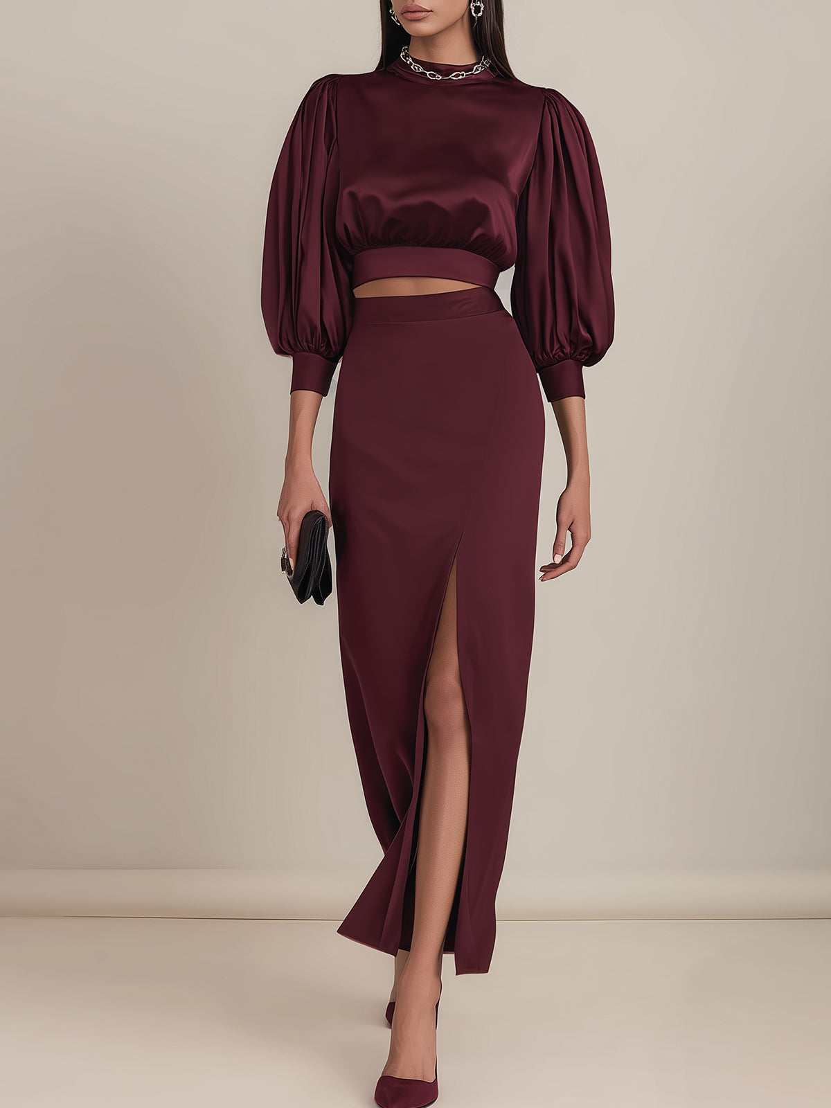 - Design: Features an elegant burgundy two-piece set with a satin puff-sleeve top paired with a matching skirt. The voluminous sleeves add a romantic and feminine touch, while the sleek satin texture enhances the overall luxurious aesthetic. The balanced silhouette creates a timeless yet modern appeal
