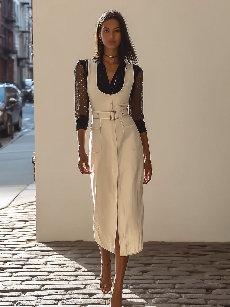 White Belted Midi Pinafore Dress With Sheer Black Top