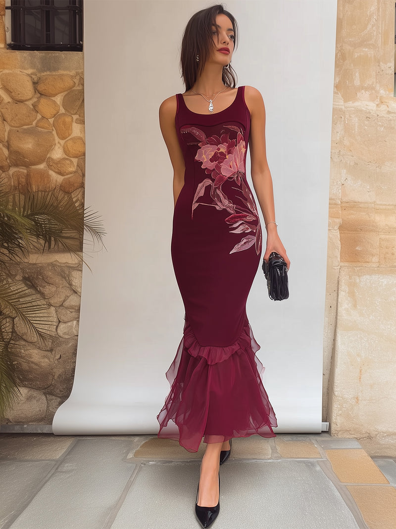 Color-blocked Geometric Print Chiffon Maxi Dress