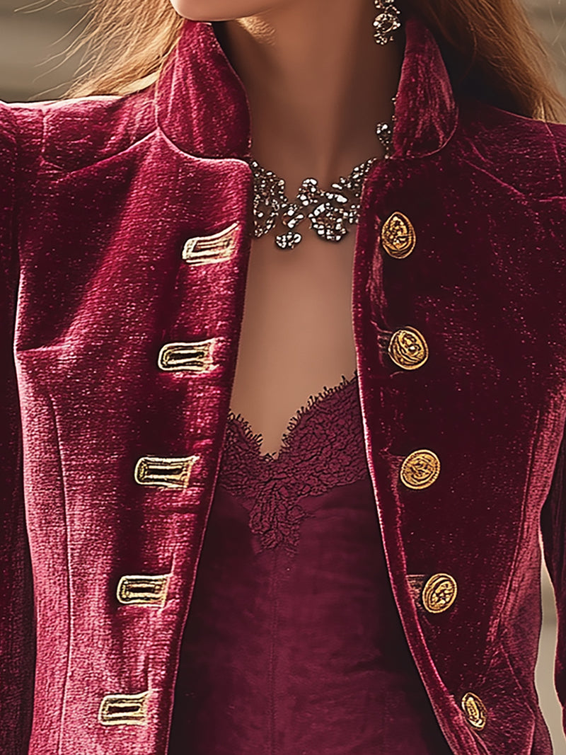 Magenta Velvet Blazer With Stand Collar And Fur Sleeve Cuffs