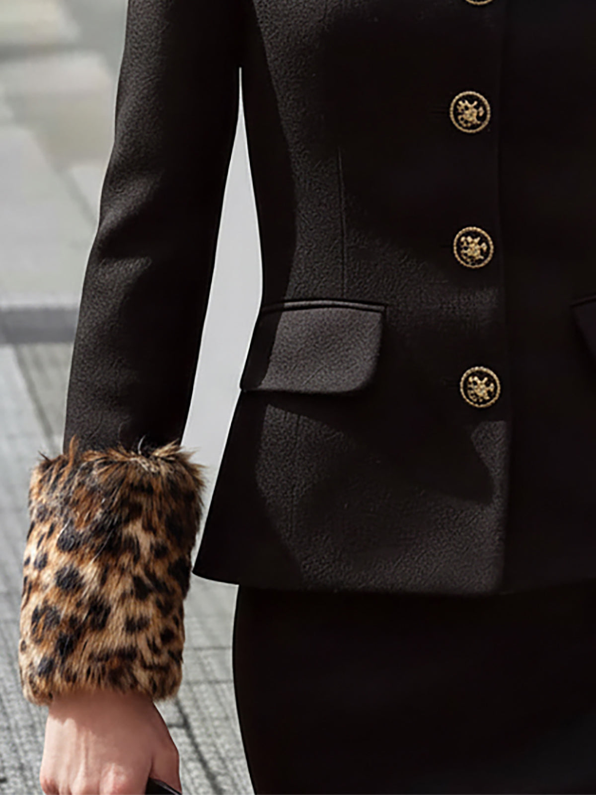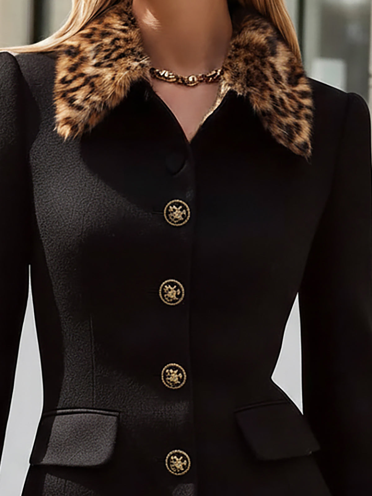 - Material: High-quality black blended fabric that provides warmth, structure, and a smooth finish, paired with soft leopard-print faux fur for added luxury
