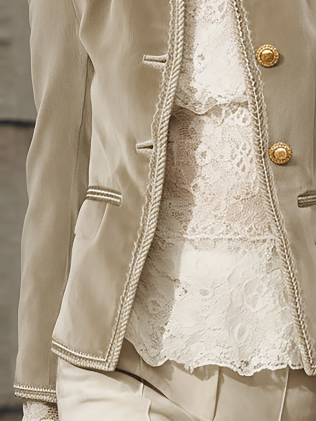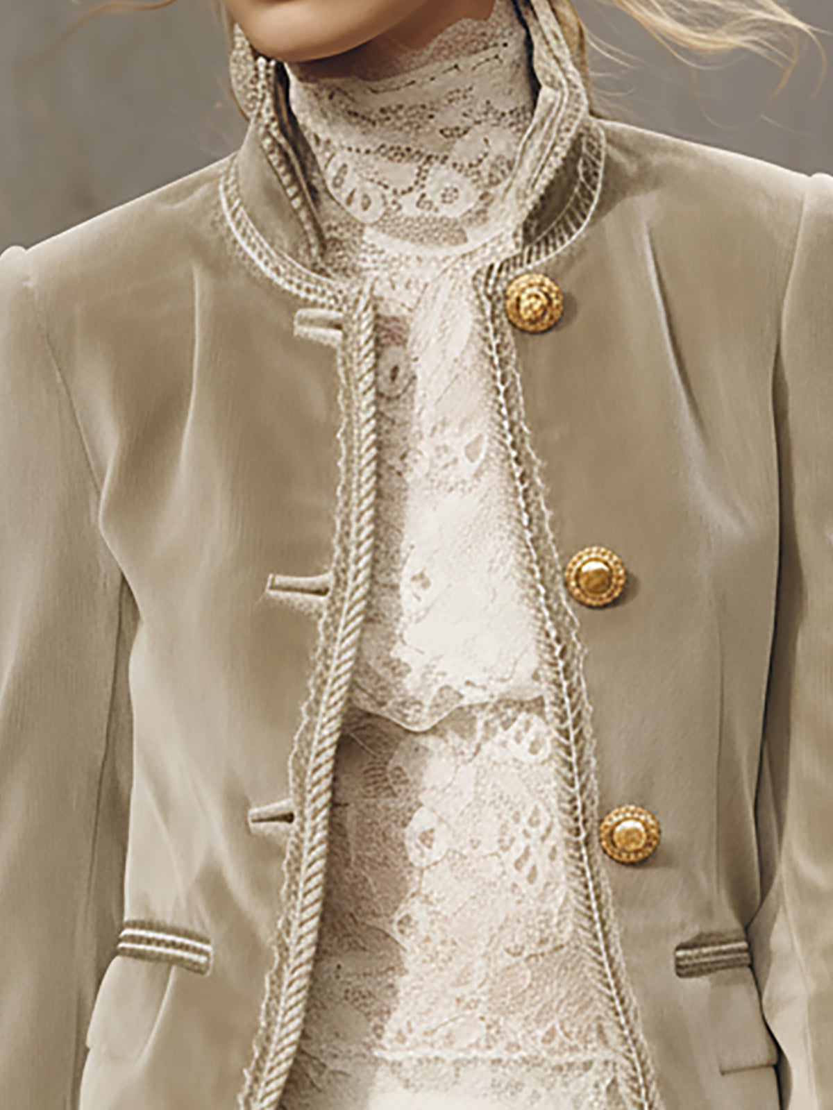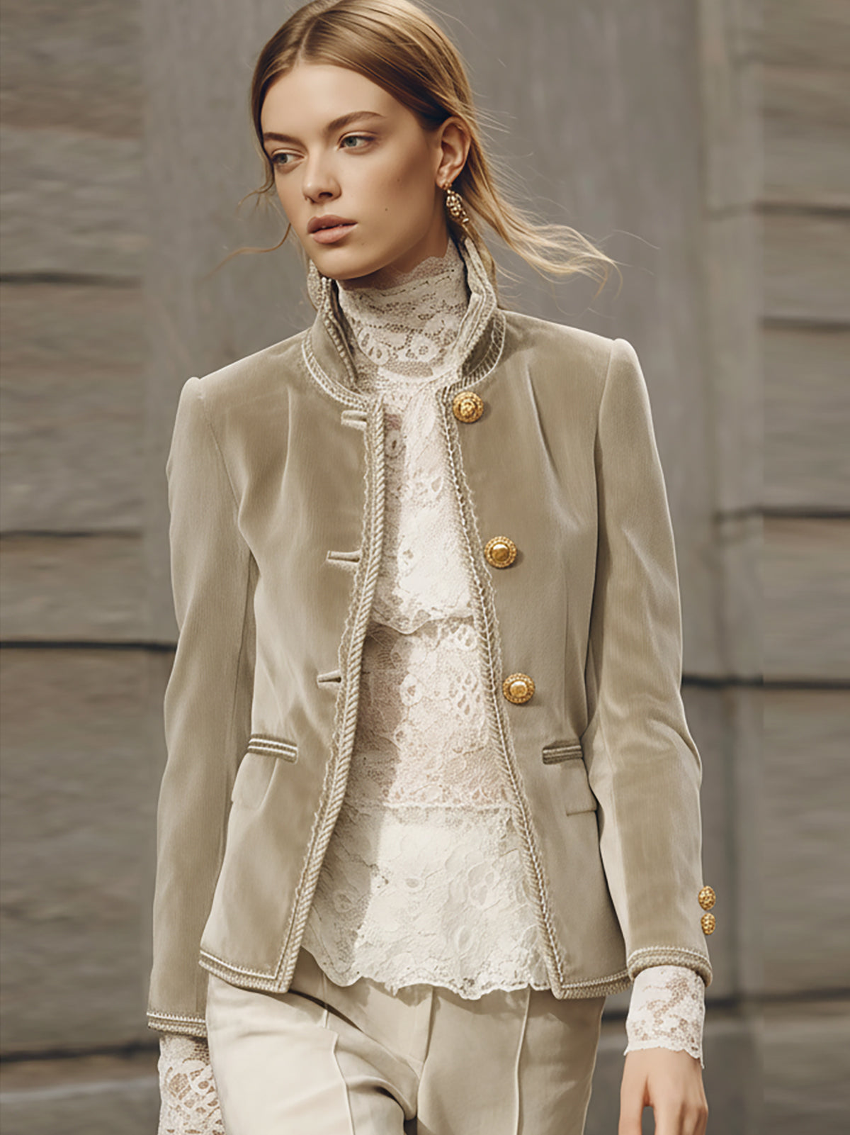 Exude understated luxury with the Light Beige Velvet Stand Collar Jacket—a timeless piece that blends elegance, comfort, and modern sophistication.