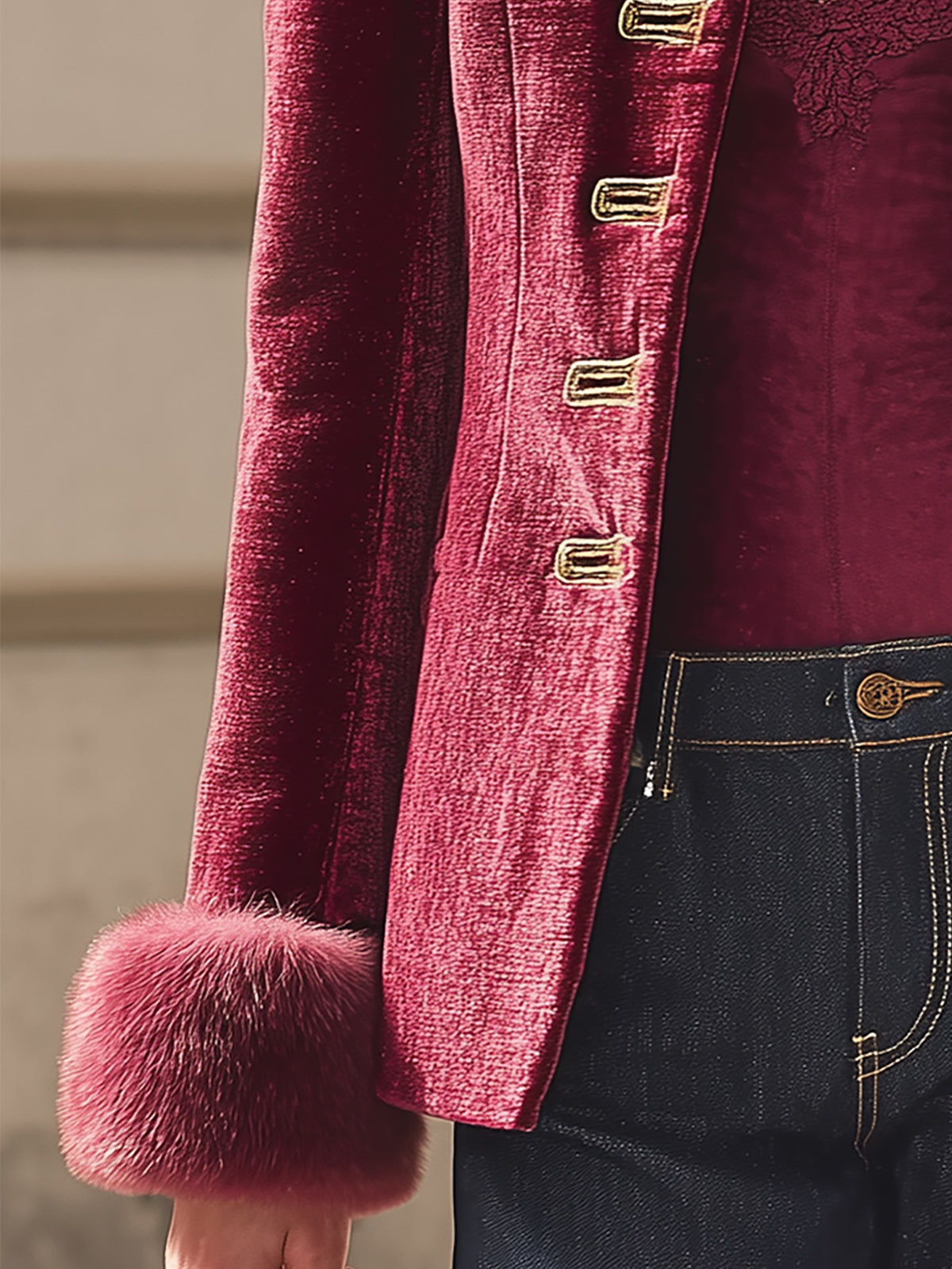 Magenta Velvet Blazer With Stand Collar And Fur Sleeve Cuffs