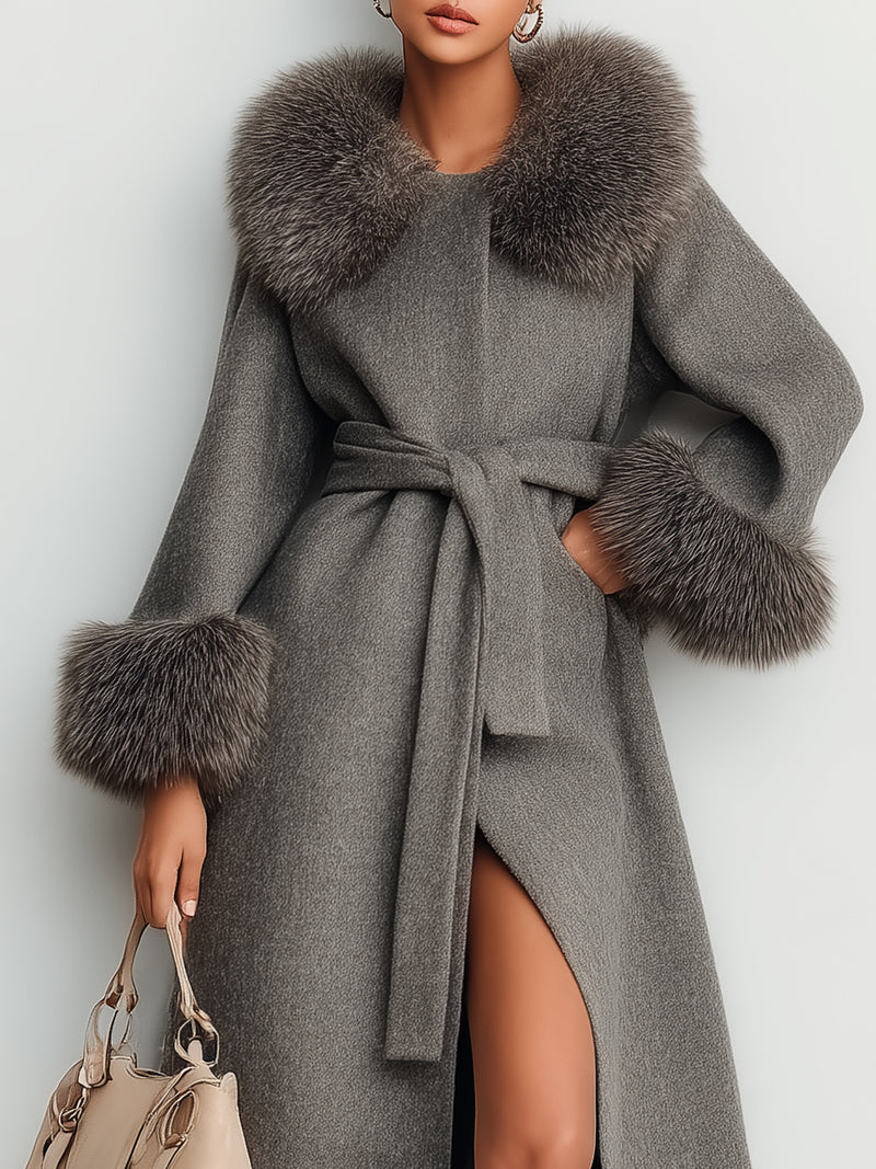 Pink Faux Fur Trimmed Coat With Belted Waist And Lapel Collar