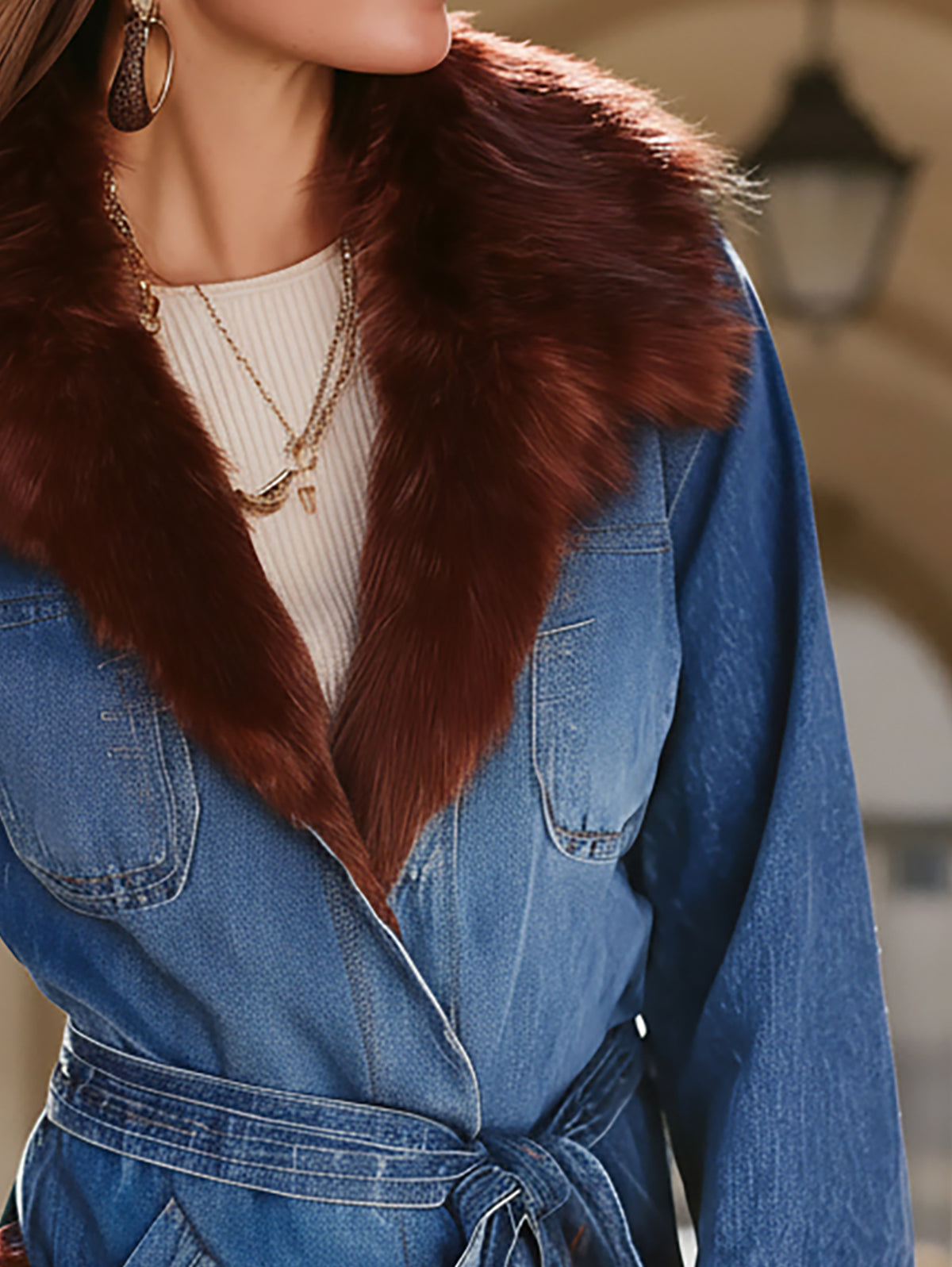 - Material: Soft blue denim combined with plush brown faux fur trim, offering both warmth and a stylish texture contrast