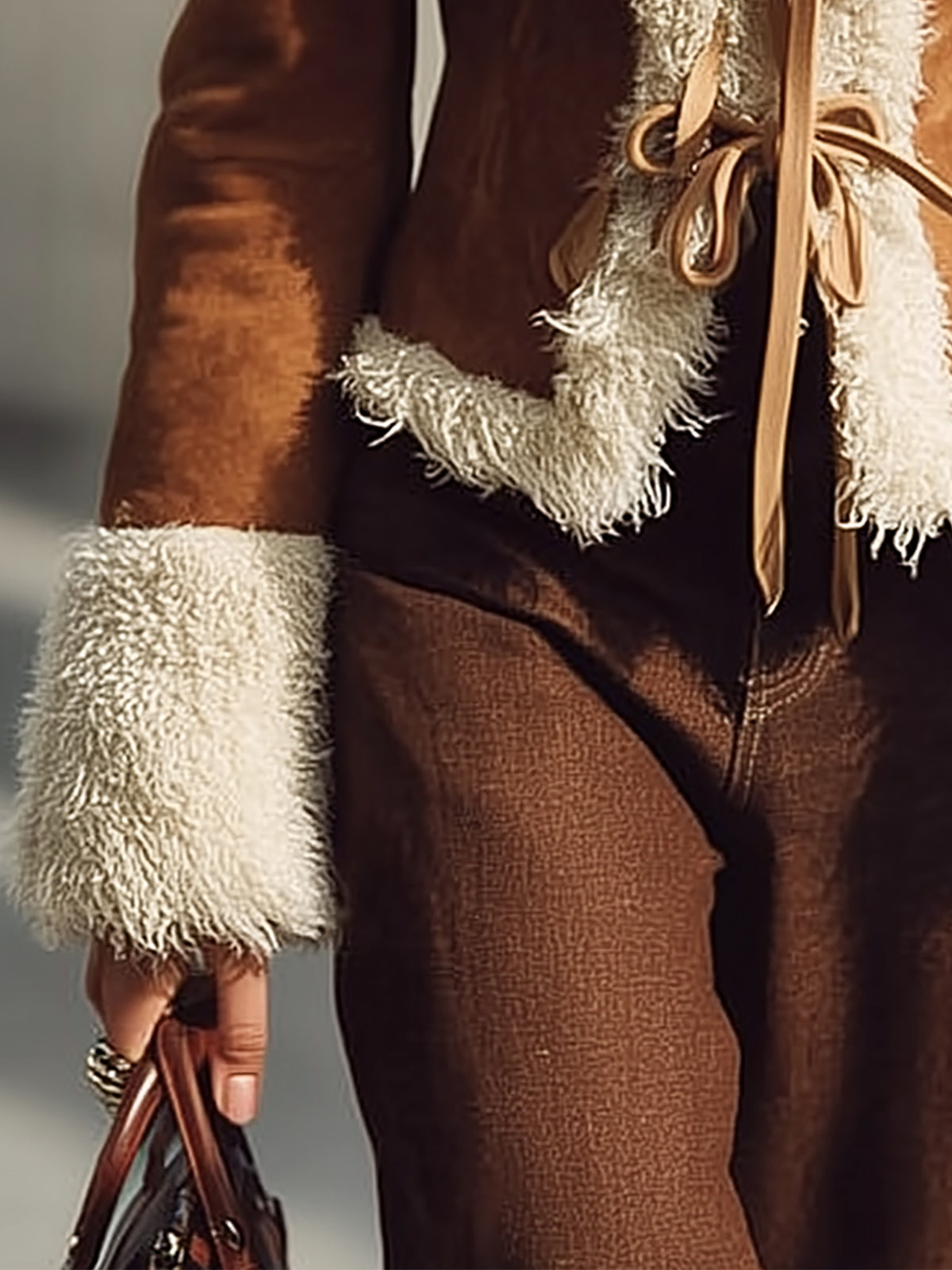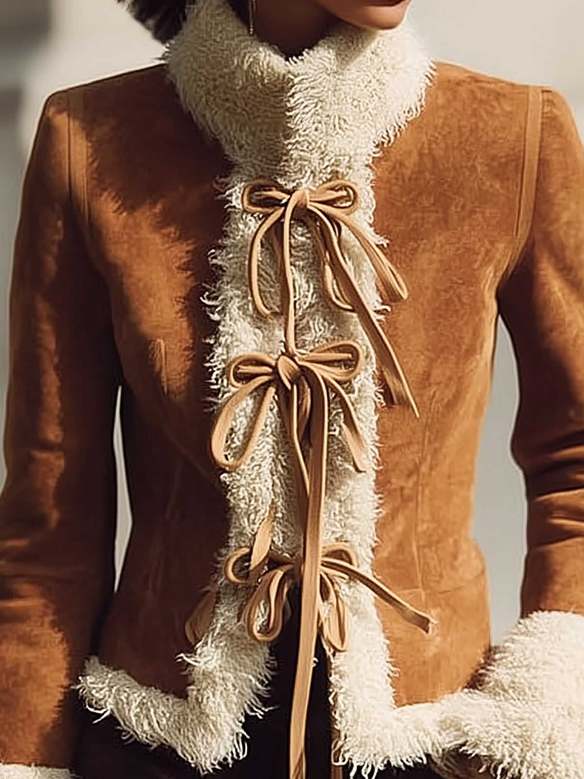 - Design: Features a chic high-collar design with faux fur detailing along the collar, cuffs, and front edges. The front ties with elegant suede bow closures, adding a feminine and stylish touch. The contrast between the tan suede and cream fur creates a luxurious and cozy aesthetic