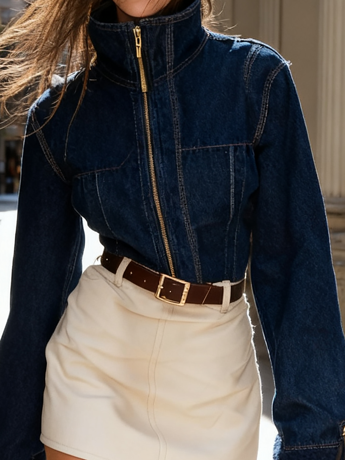 This denim jacket features a high neck, gold zipper, and fleece cuffs, creating a chic and unique look. The structured design and stylish details make it perfect for elevating casual outfits or adding a trendy touch to urban ensembles. Pair it with different bottoms to embrace the versatile, fashion-forward vibe.