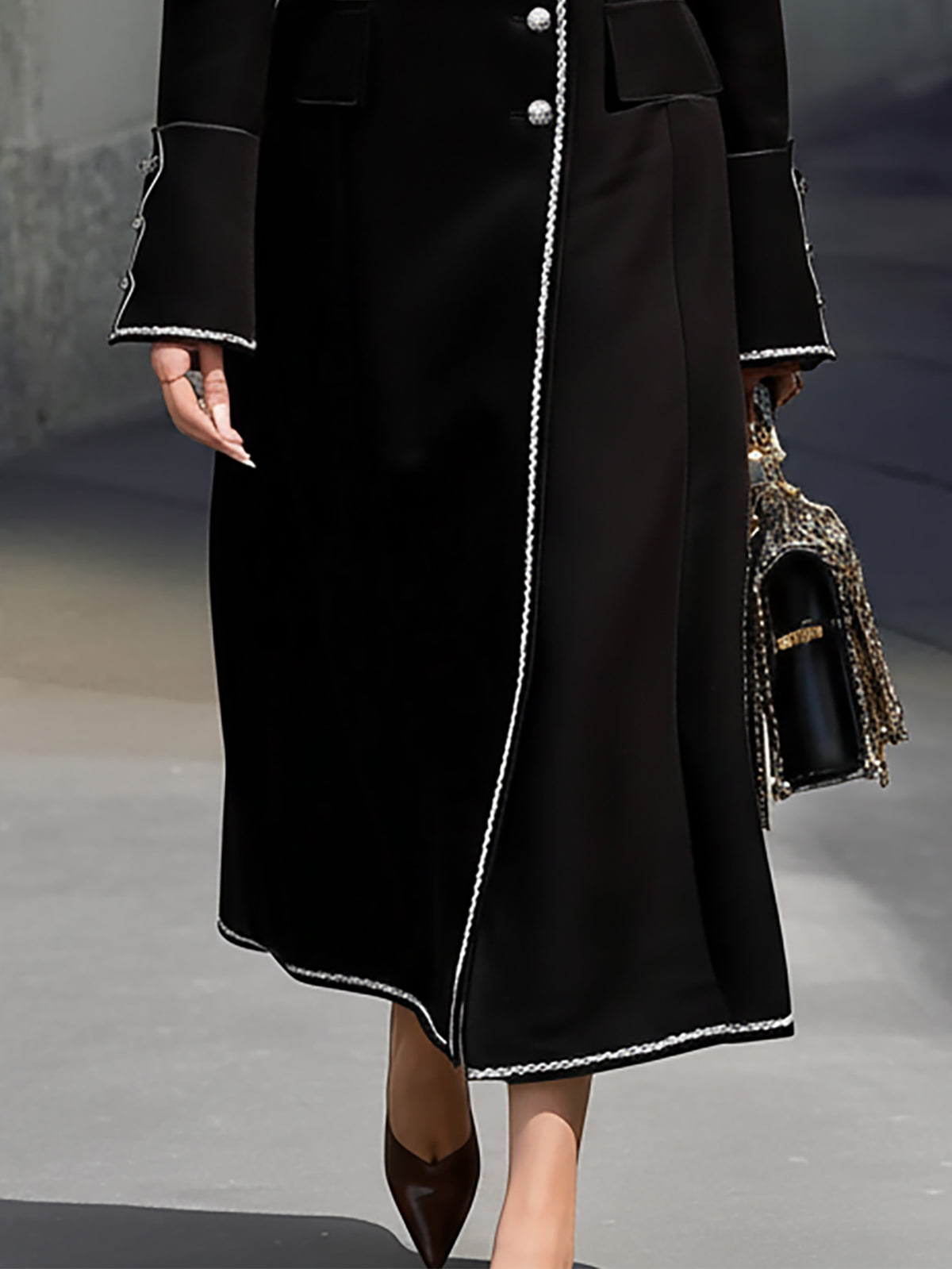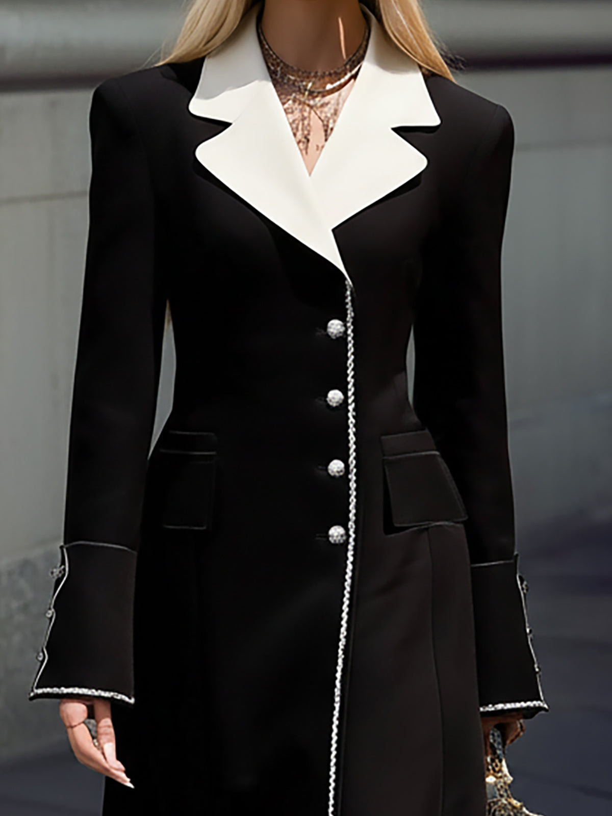 • Design: Features a classic black coat design with elegant flared sleeves and a contrasting white lapel, creating a sophisticated and modern silhouette; includes a tailored waist to enhance shape