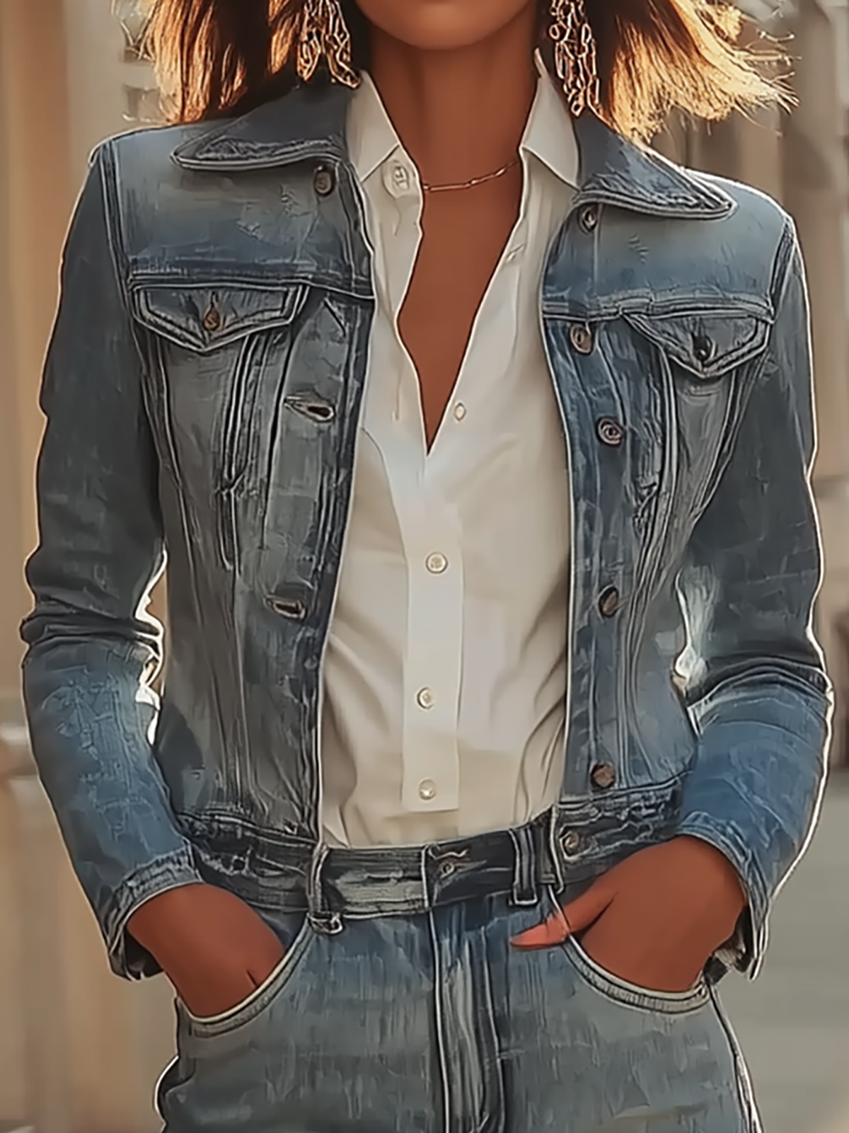 This light blue denim jacket features a classic collar, buttoned front, and distressed detail, creating a chic and retro look. Ideal for casual outings or trendy city strolls.