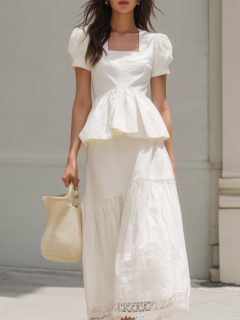Square Neckline Ruffled Resort Style Cotton And Linen Skirt Set