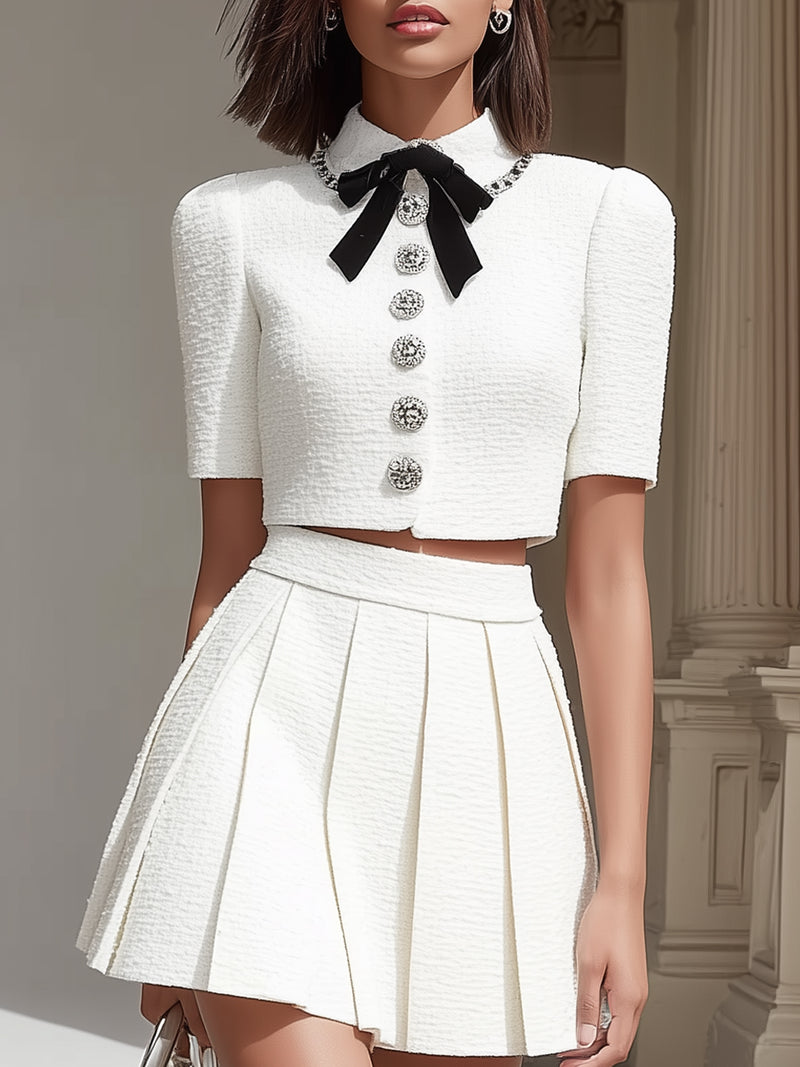 Chicnery Satin Bow Tie Black Tweed Bell-sleeves Top And Pleated Skirt Suits