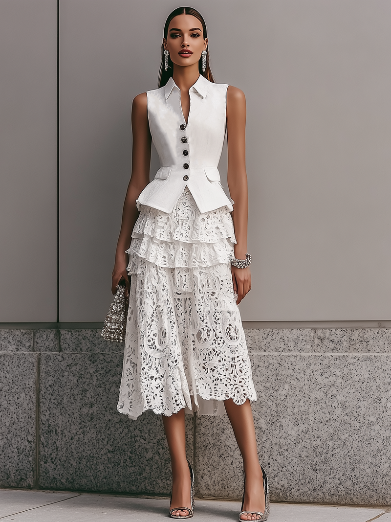 White Sleeveless Blazer And Tiered Lace Skirt Set