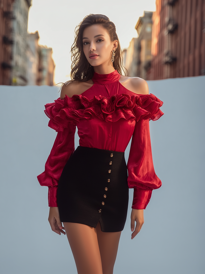Red Ruffle Halter Top And Black Button Skirt Set