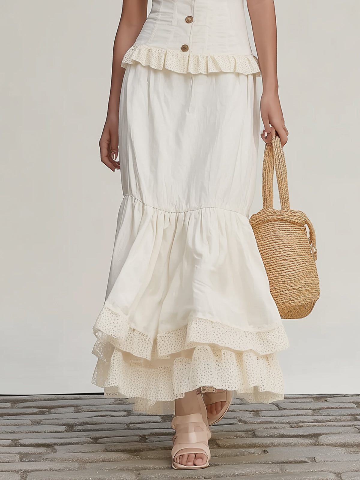 Square Neckline Ruffled Resort Style Cotton And Linen Skirt Set