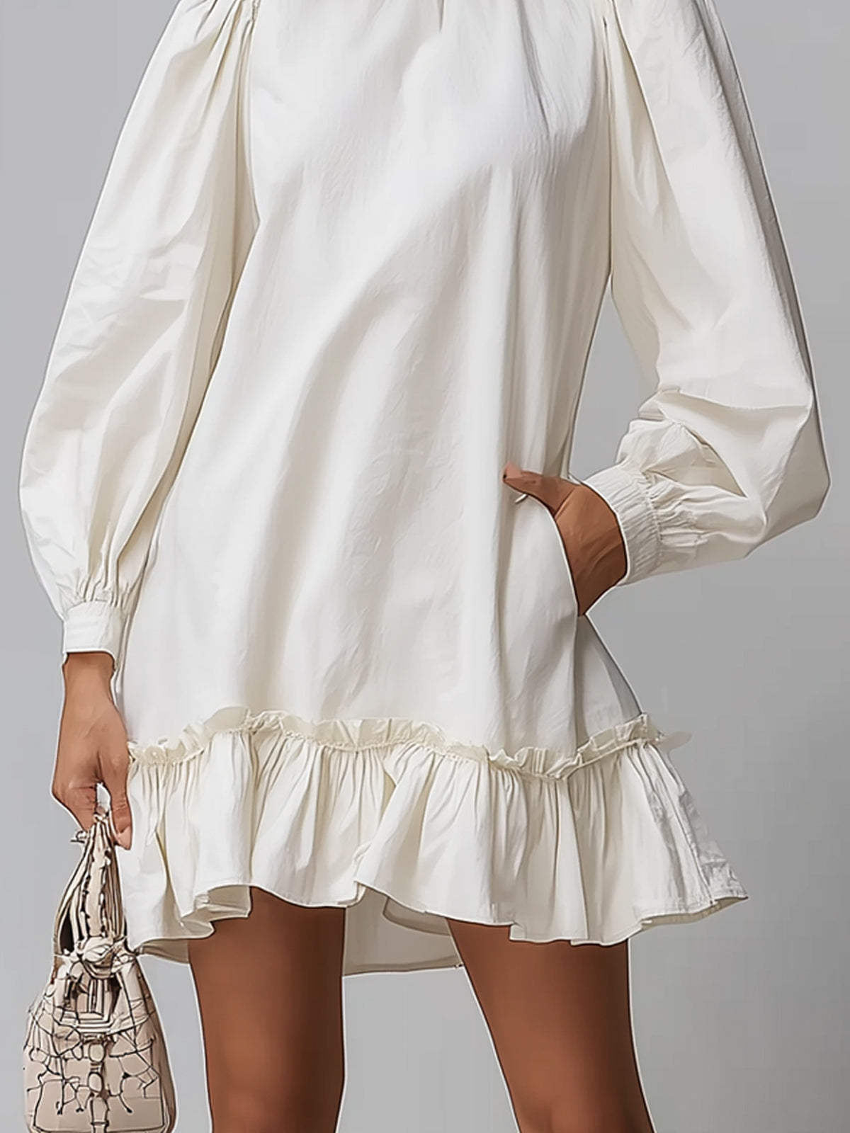 Elegant Cream-white High-neck Puff-sleeved Mini Dress