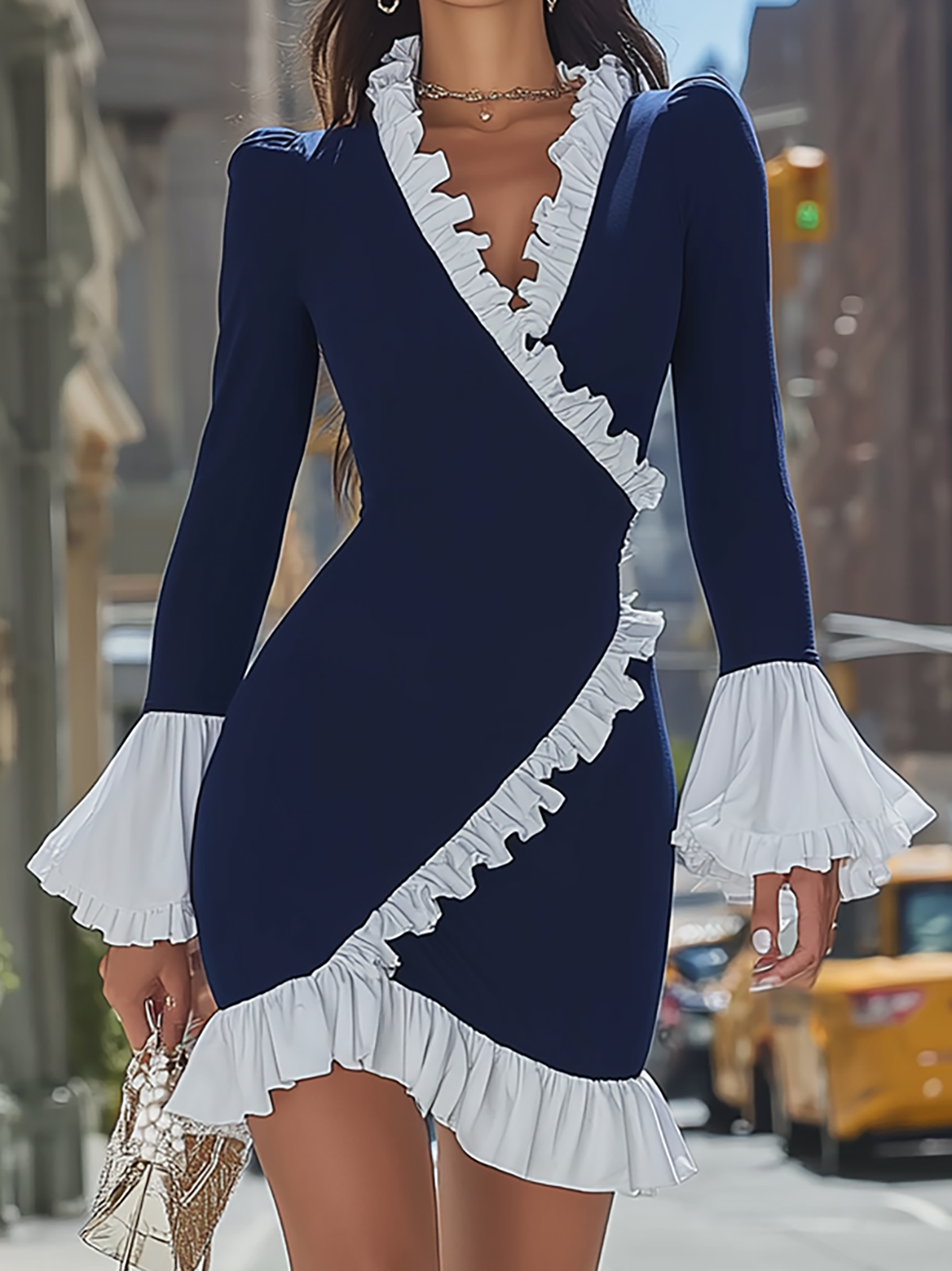 This navy mini dress blends bold contrast with romantic flair. It features a form-fitting silhouette lined with asymmetric white ruffles that trace the deep V-neck and hem, plus billowy bell sleeves in matching white. The sleek navy base balances the soft, airy details, making it ideal for cocktail hours, date nights, or city outings. Its mix of structured shape and playful texture feels both polished and whimsical—effortlessly turning heads while keeping you comfortable.