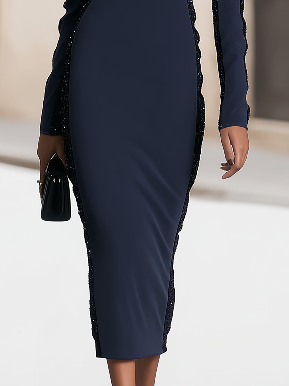 Make a stunning statement with the Navy Midi Dress With Sequin Accents—a modern, chic design for the stylish and confident woman.
