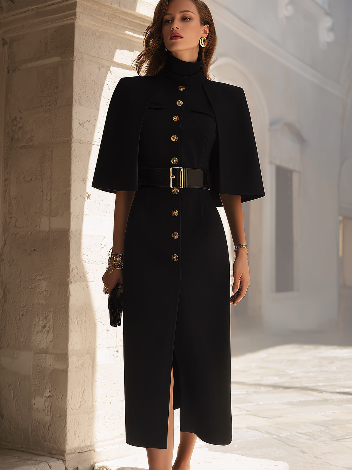 Design: This sophisticated midi dress features a stand collar and unique cape-style sleeves that drape gracefully over the shoulders, adding a touch of drama and modern flair. The front is detailed with five vertical gold-tone buttons for a polished accent, while a sleek black belt with a gold buckle cinches the waist to enhance the silhouette. Designed with a subtle front slit for ease of movement and visual interest