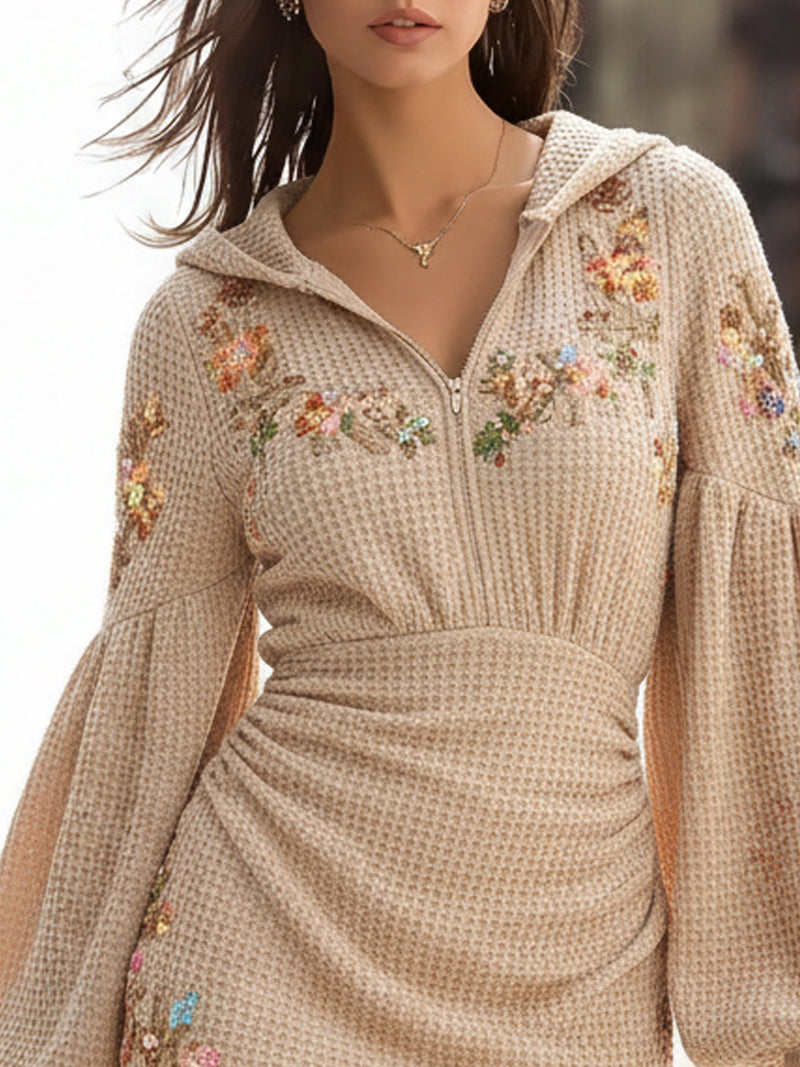 Waffle-textured Embroidered Mini Dress With Flared Sleeves