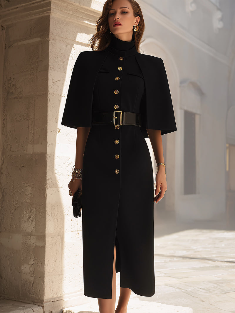 Stylish Black Cape - Sleeved Midi Dress With Belt