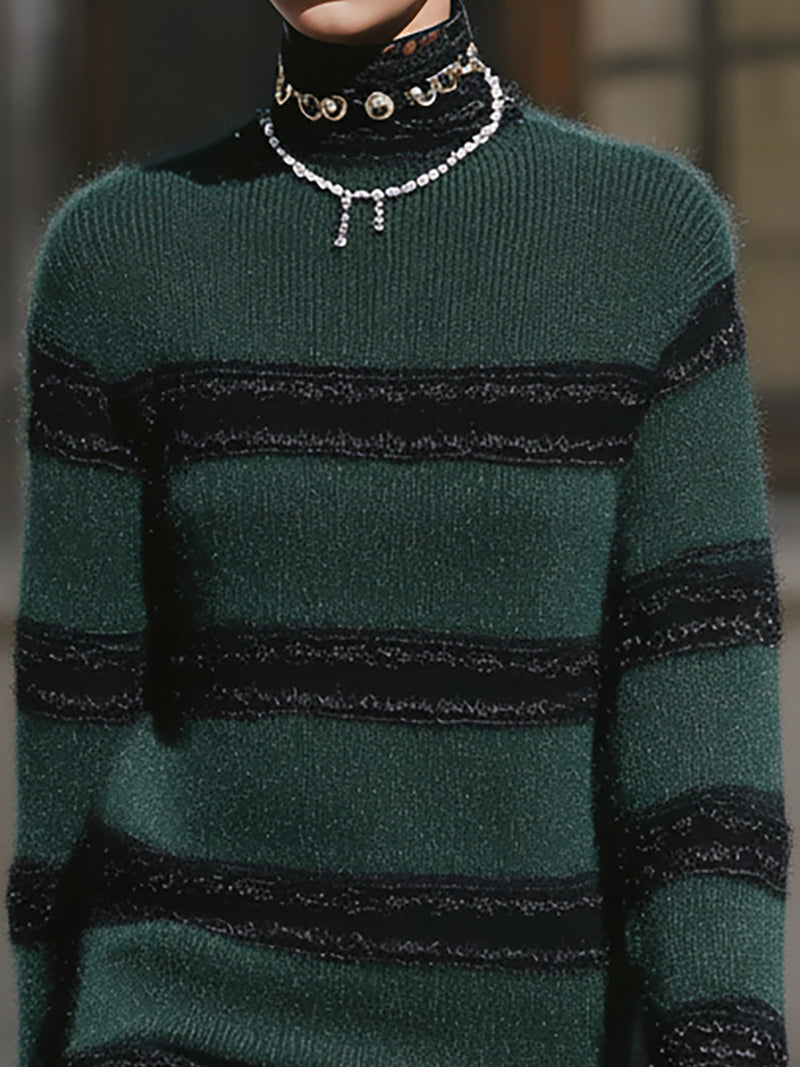 Elegant Dark Green Mohair Dress With Black Lace And Stripes