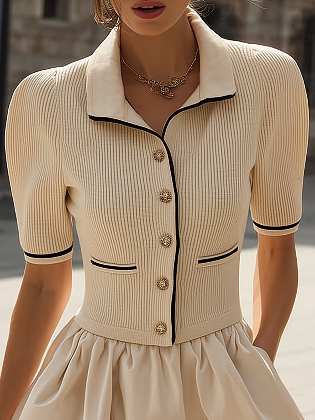 • Design: Features a fitted beige knit top with a classic neckline, paired with a voluminous satin puff skirt that adds a playful yet elegant touch