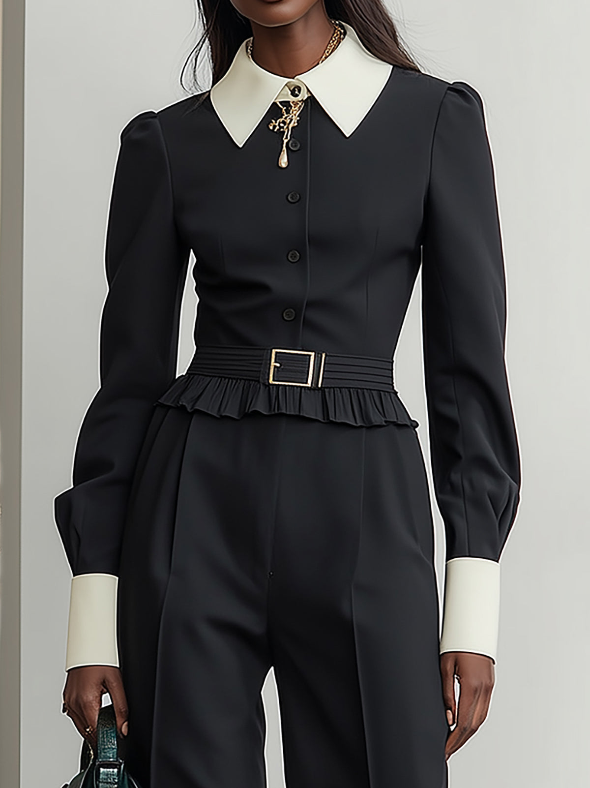 Design: Features a long-sleeve blouse with a cream-white shirt collar and coordinating cream cuffs, subtle peplum hem, and a slightly relaxed fit
