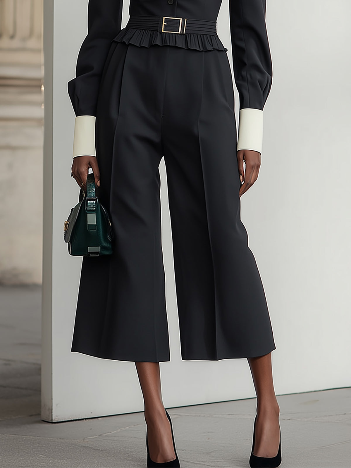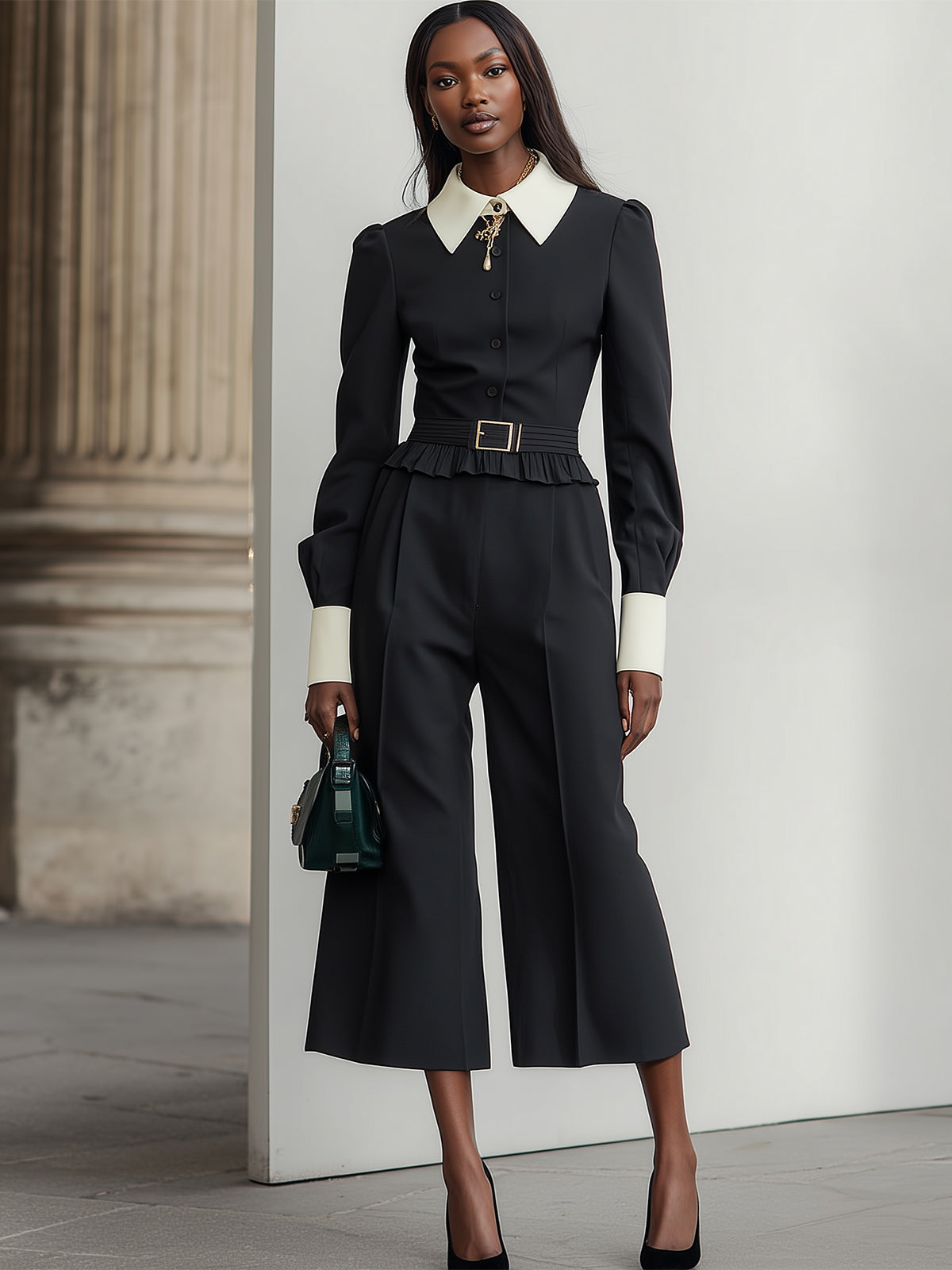 The Black and Cream Contrast Shirt Wide-Leg Pants Set is a sophisticated, minimalist ensemble designed for the confident, fashion-forward woman.
