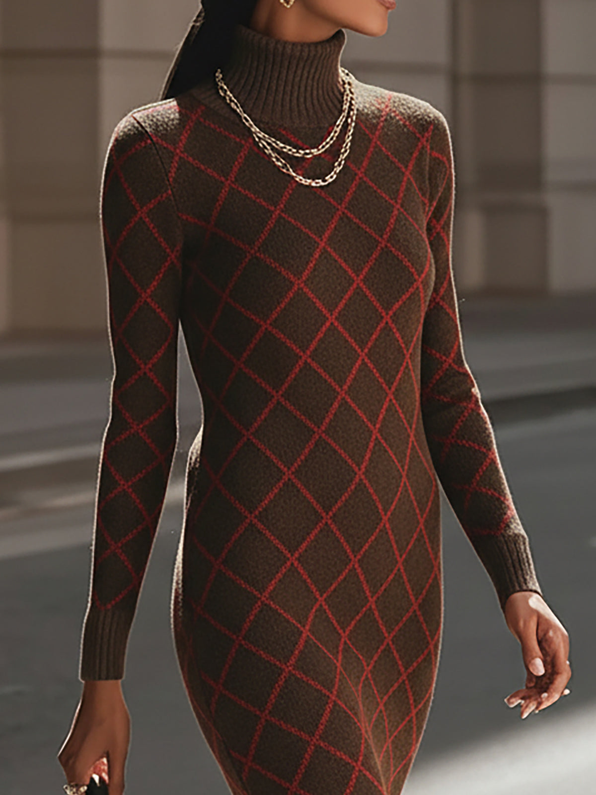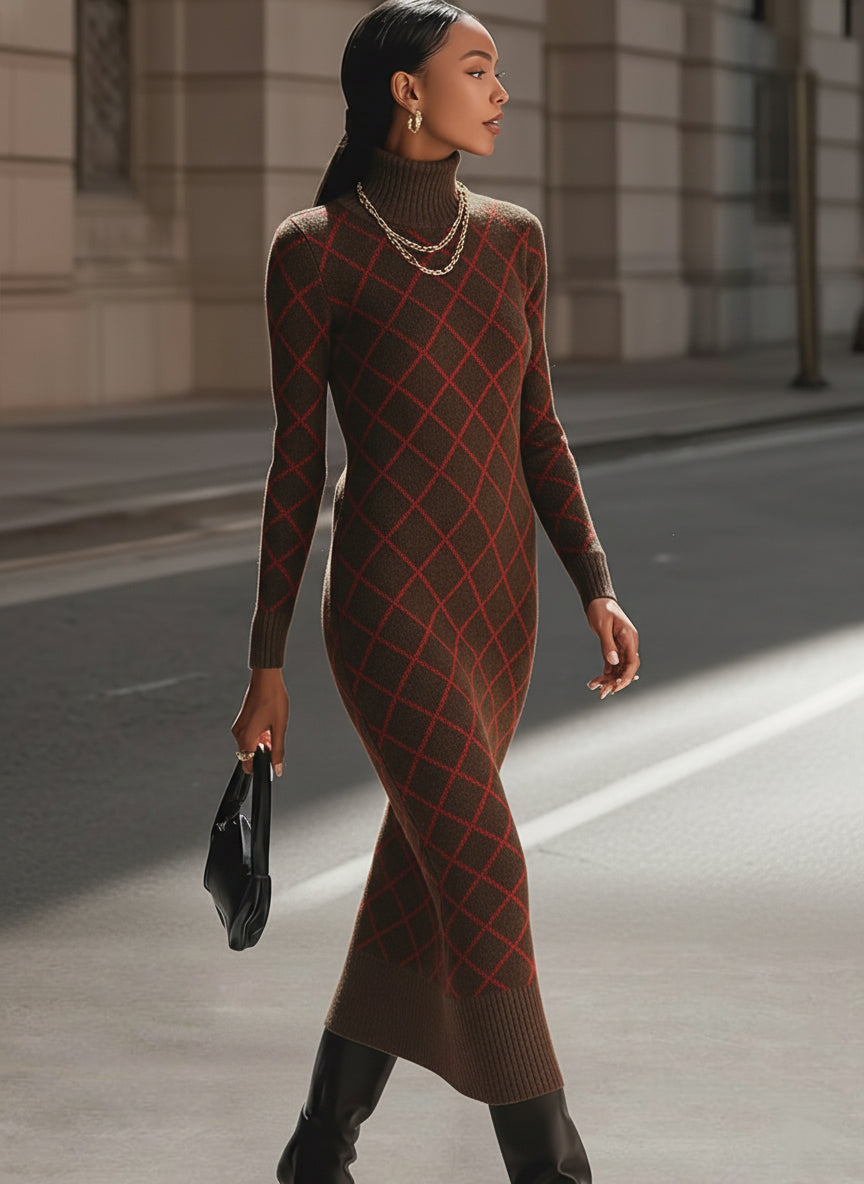 Design: Features a classic turtleneck and long sleeves, with an all-over argyle pattern in complementary shades of brown for a timeless, sophisticated look. The dress has a straight silhouette with a slightly fitted waist to flatter the figure