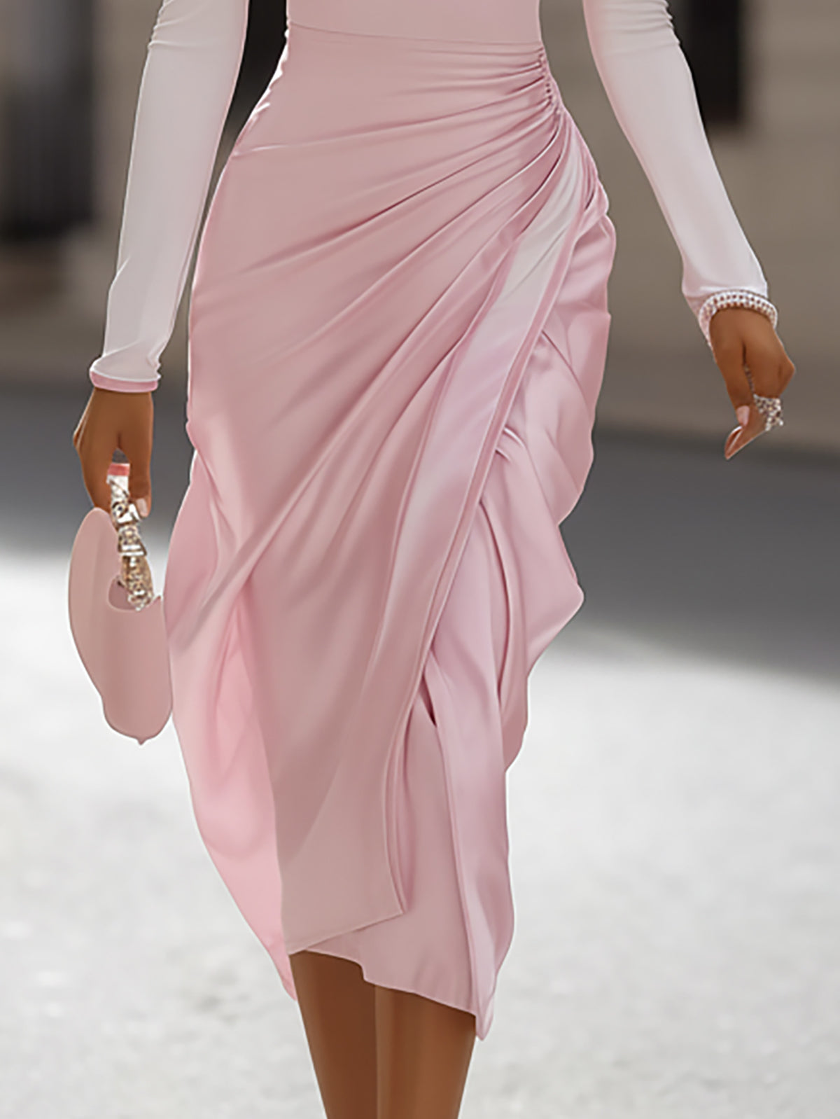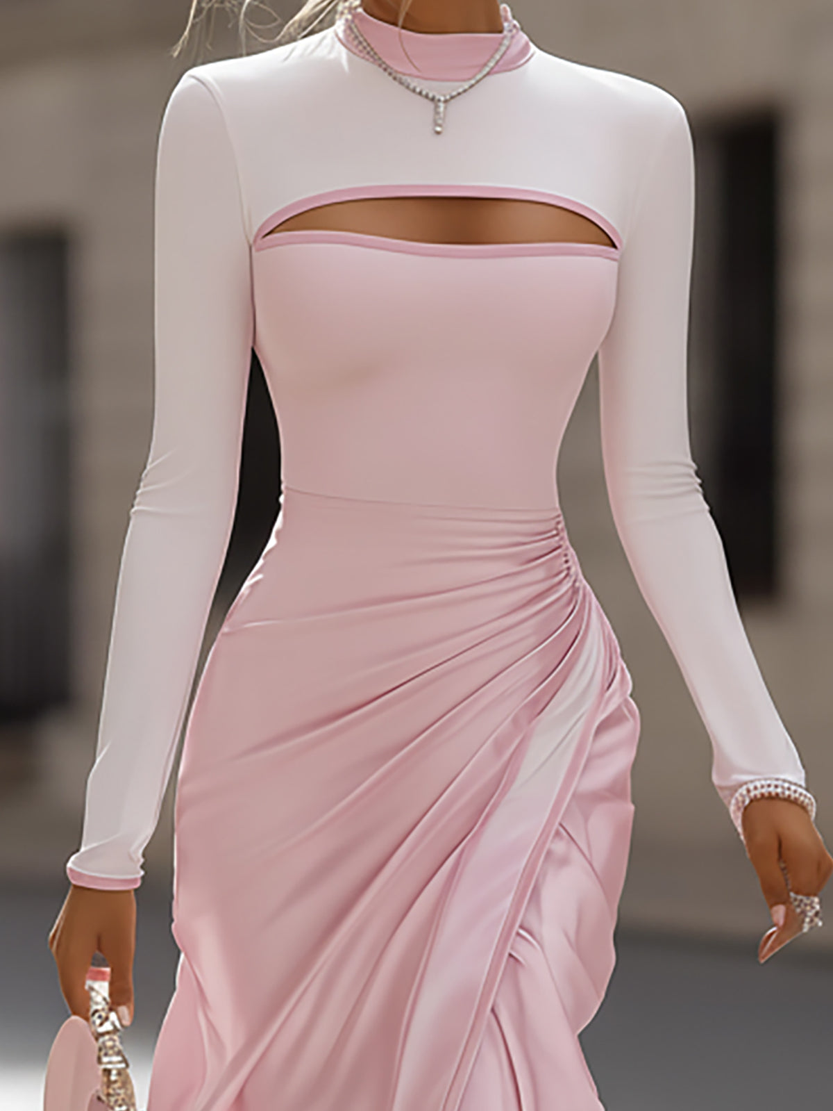 Design: Elegant high-neck midi dress in light pink and white color-block design, featuring a small horizontal cutout below the neckline, subtle horizontal ruching on the lower half, and a gentle ruffle detail cascading from the left waist to the hem for a graceful, feminine look