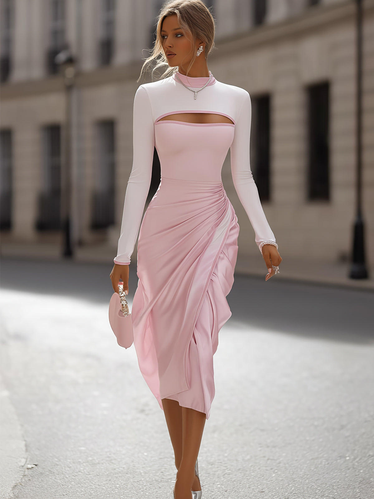Embrace modern femininity with the Elegant Light Pink Color-Block Ruched Midi Dress with Cutout Detail—a timeless design that blends sophistication, structure, and effortless grace.