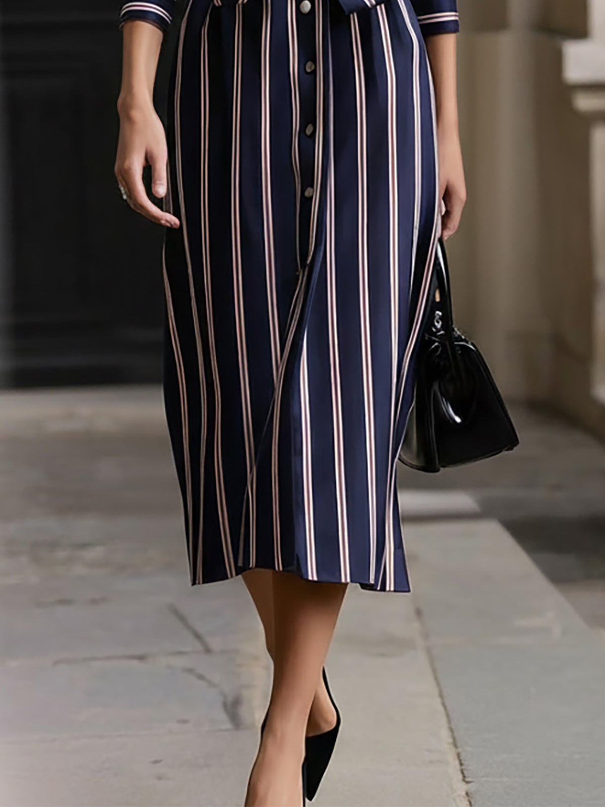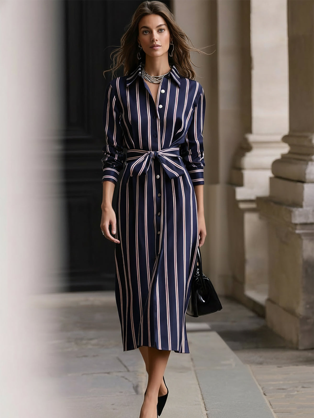• Design: Features a navy base with vertical light pink stripes, a classic shirt collar, V-neckline, long sleeves with optional rolled cuffs, and a waist tie on the left side for a feminine accent. Minimalist, elegant, and thoughtfully detailed
